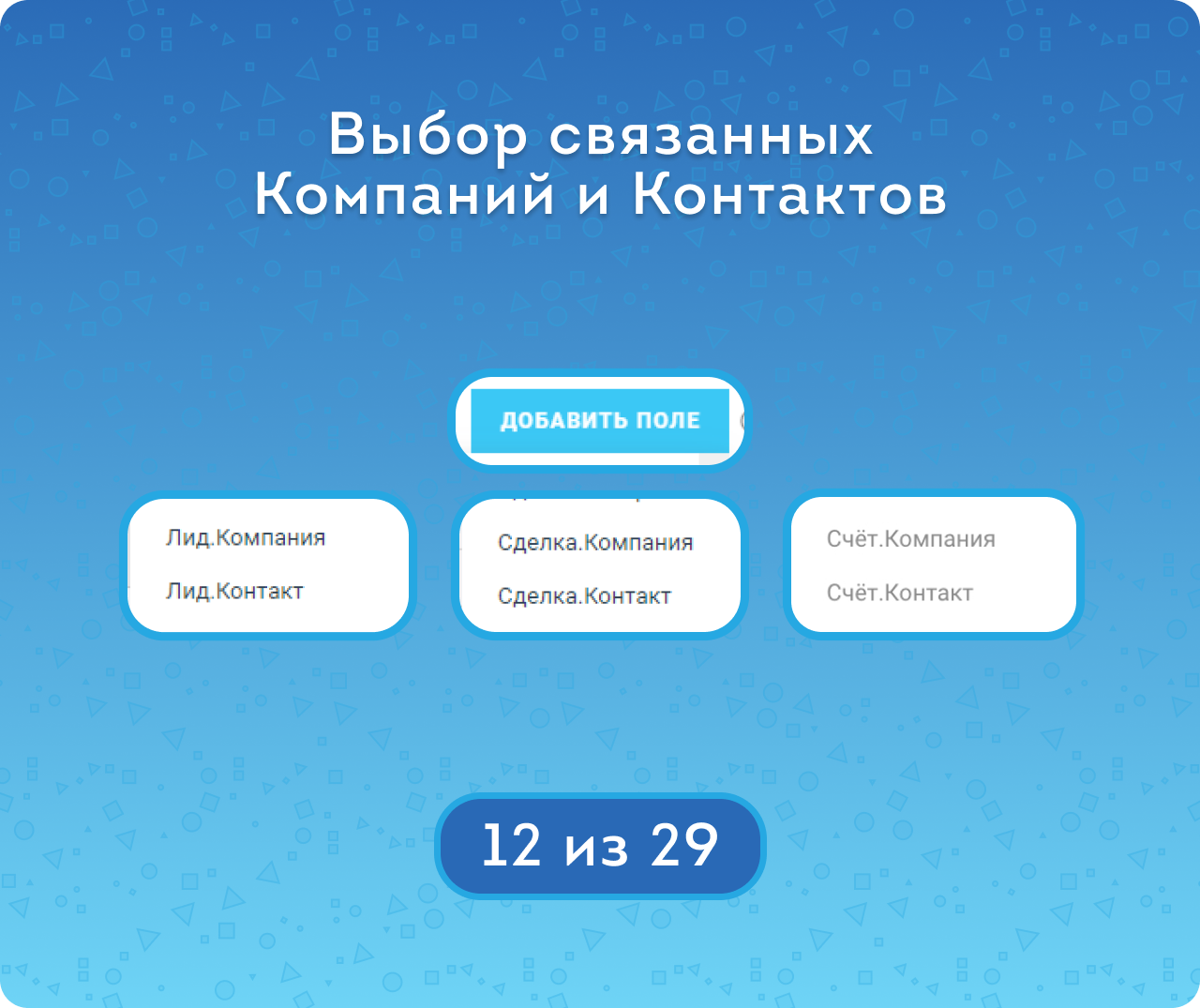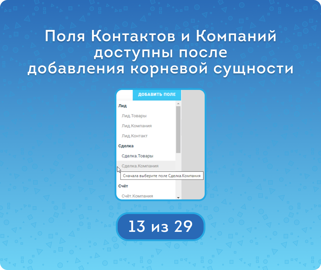 Для этого сначала нужно выбрать поле Компания или Контакт в основной сущности (например, если отчет по Сделкам — то Сделка.Компания).. Тогда выбор типовых и пользовательских полей будет доступен.