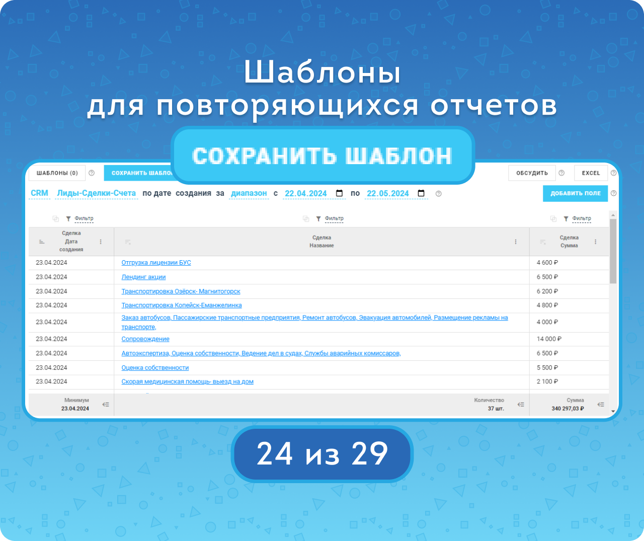 Любой отчет можно сохранить как шаблон с заданными полями, сортировкой и фильтрами. Название шаблона легко поменять, а также внести в него изменения.