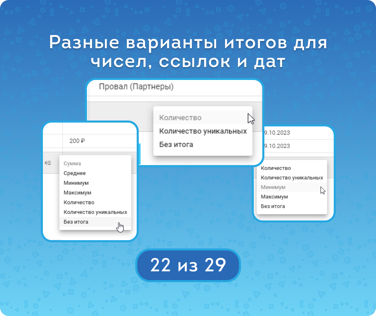 - Подбирать вариант итогов в зависимости от типа поля: Сумма, Минимум, Максимум, Среднее, Количество, Количество уникальных.