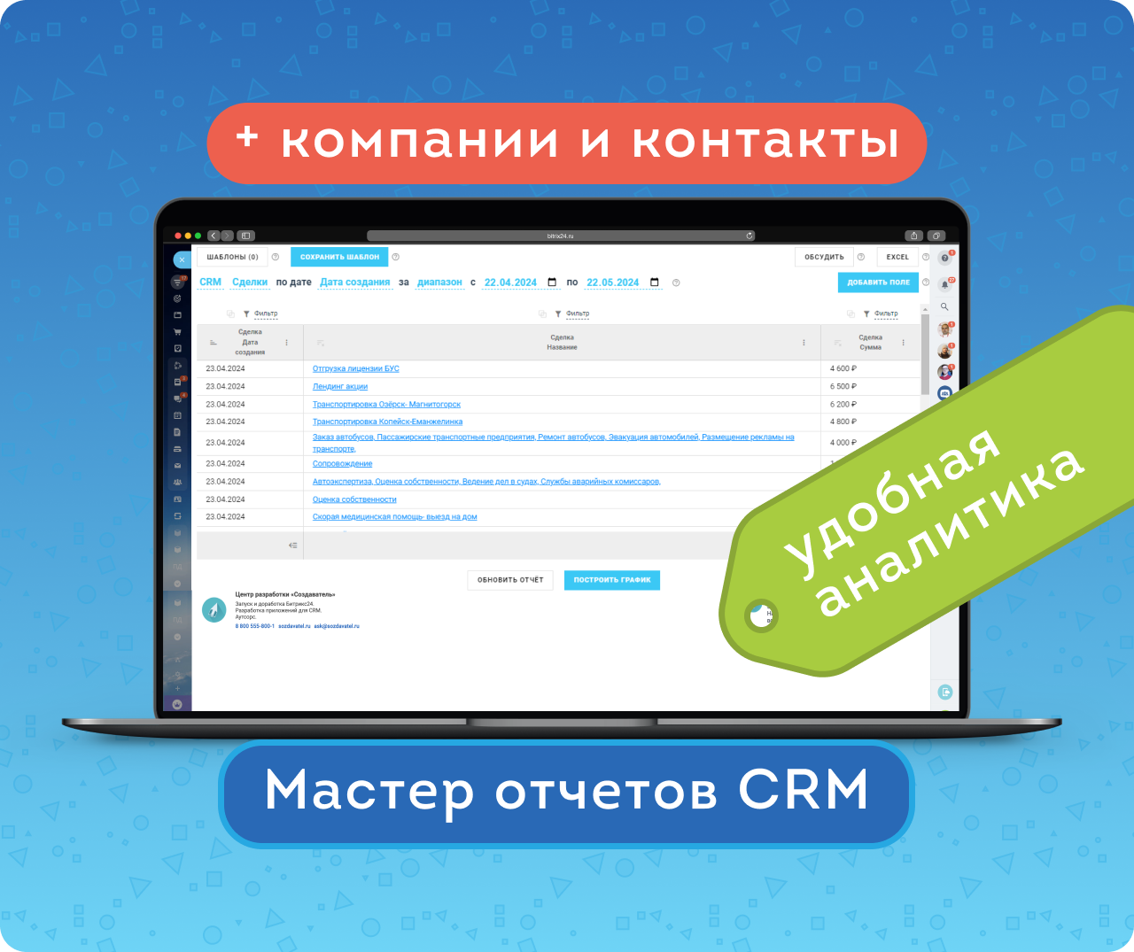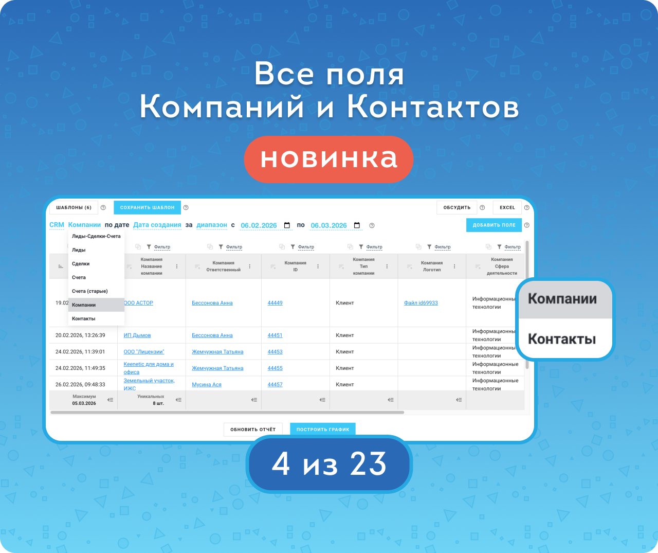 — 28.03.2026: добавили возможность строить отчеты по полям контактов и компаний