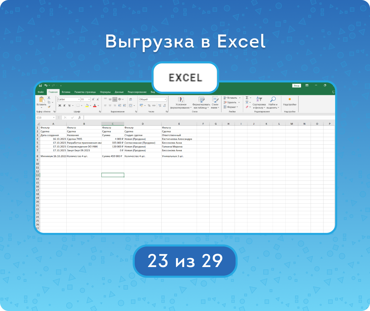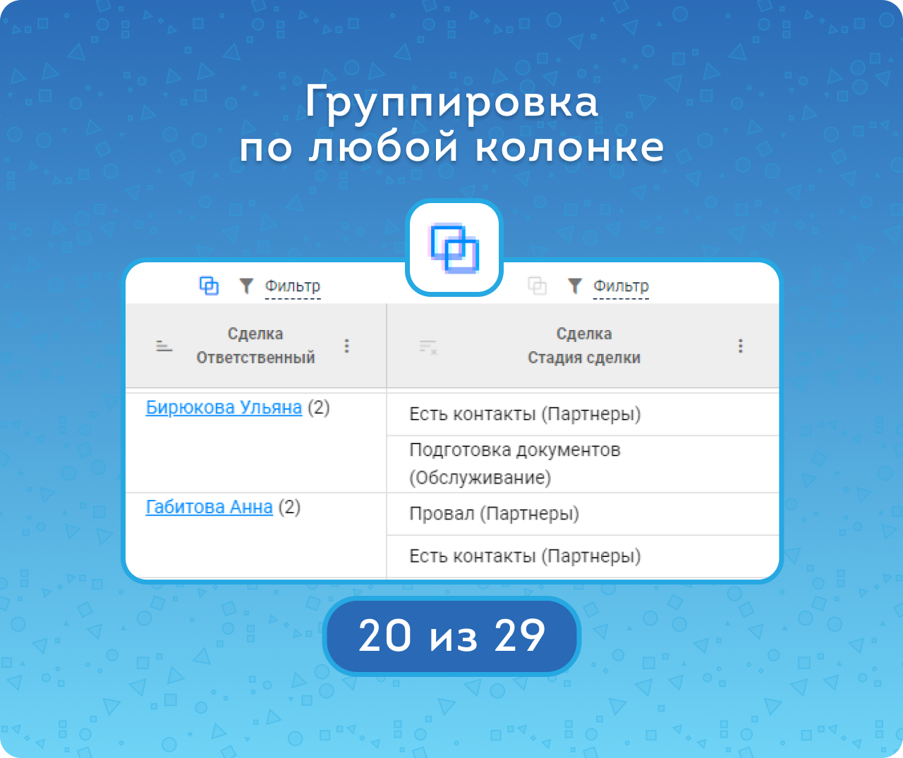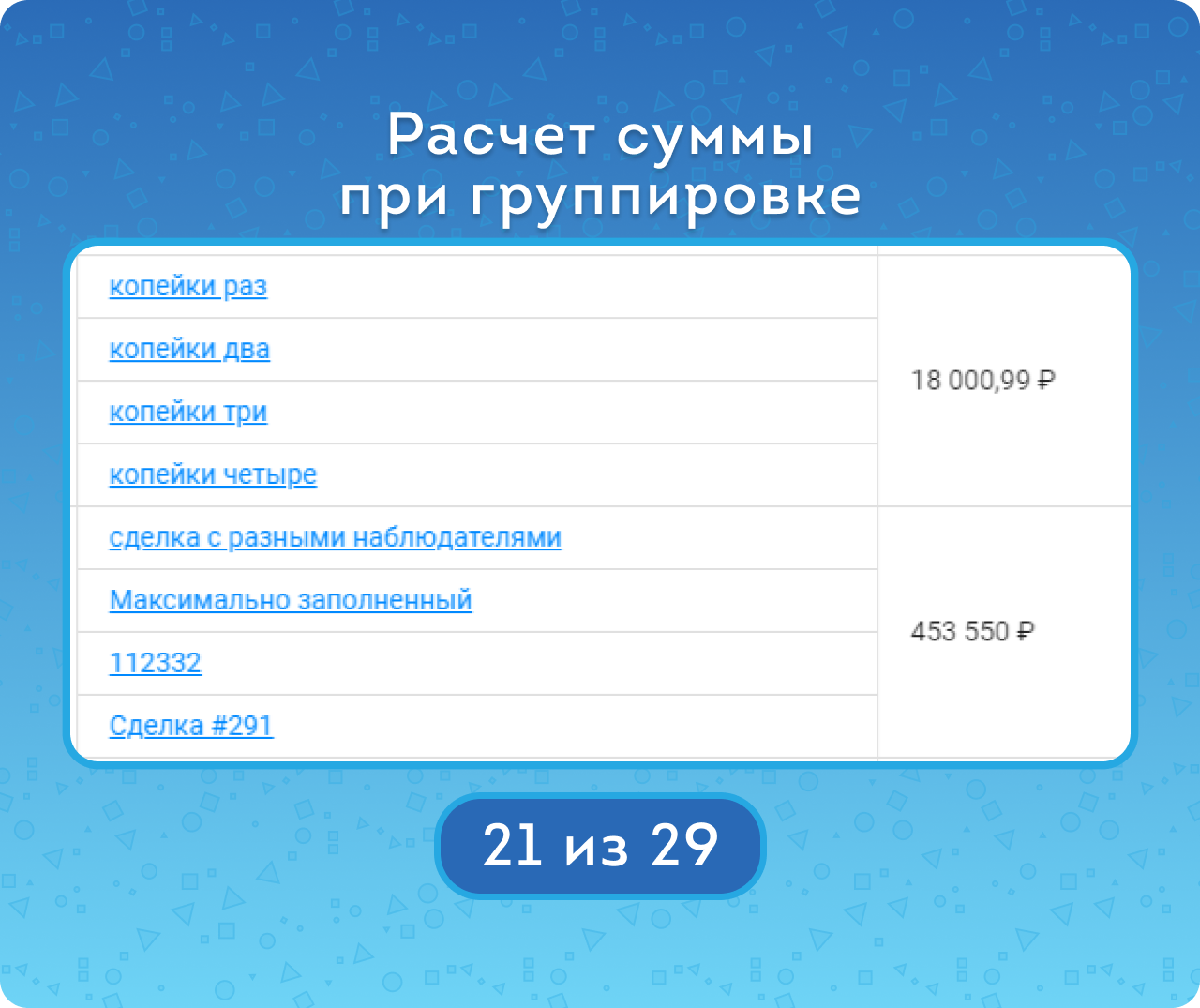 - Используя группировку, видеть промежуточные итоги помимо общих. Например, сколько Лидов в каждой стадии. А также группировать по временным периодам — дням, неделям, месяцам, кварталам или годам.