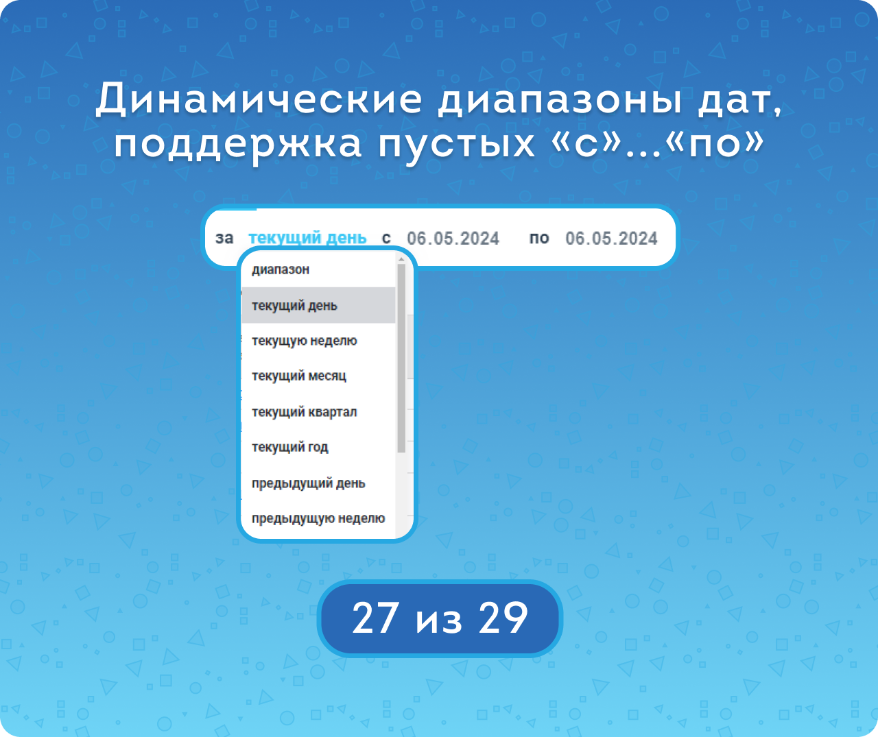 - Удобно выбирать данные за диапазон, текущий и предыдущий день/неделю/месяц/квартал/год, а также за последние N дней. А если в диапазоне убрать даты “С” и “По” — можно вывести данные за весь период.