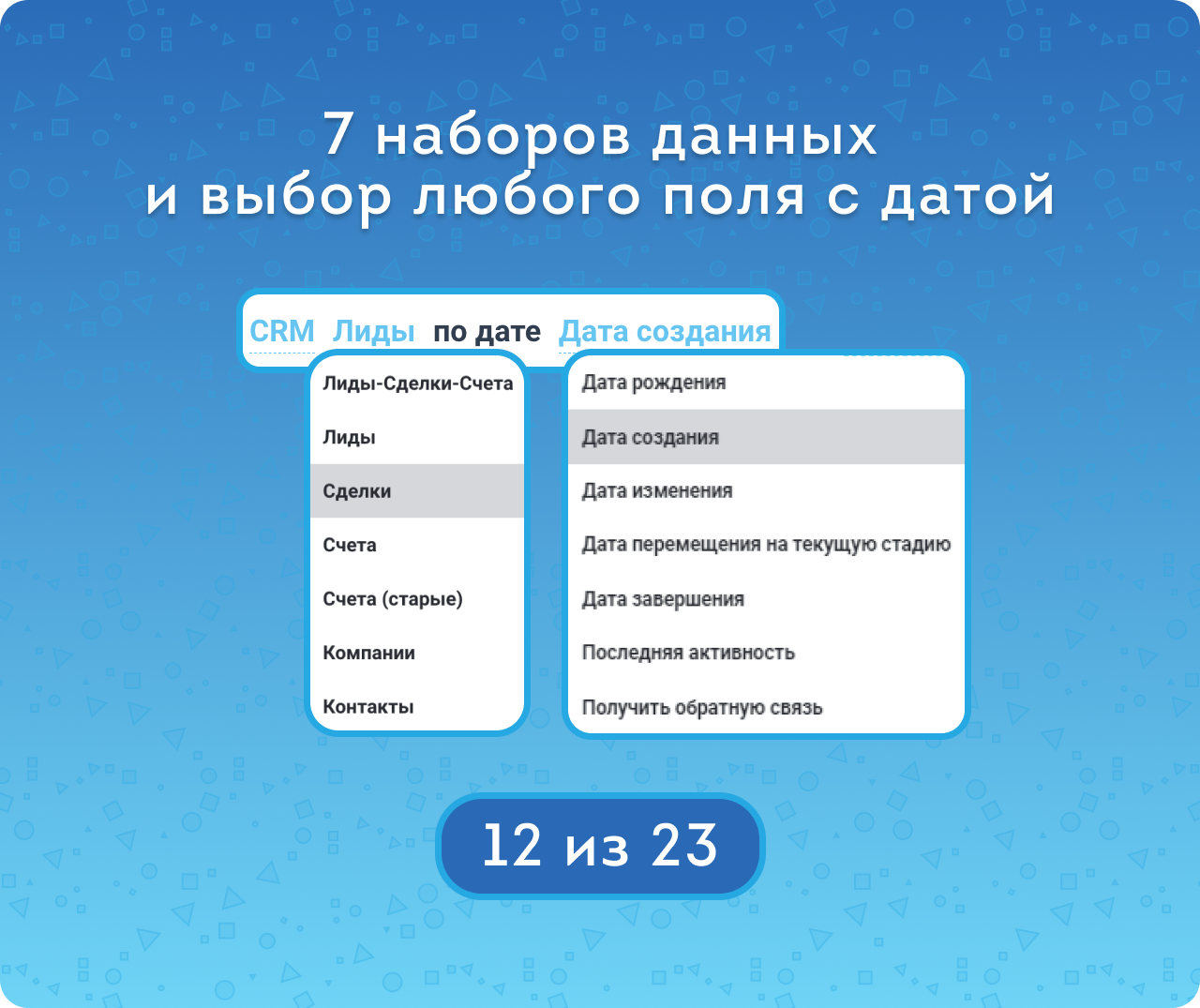 - Менять дату, по который происходит выборка данных. Можно выбирать Лидов — по Дате завершения, Контакты — по Последней активности или вообще по пользовательским полям. Для этого предусмотрены отдельные режимы.