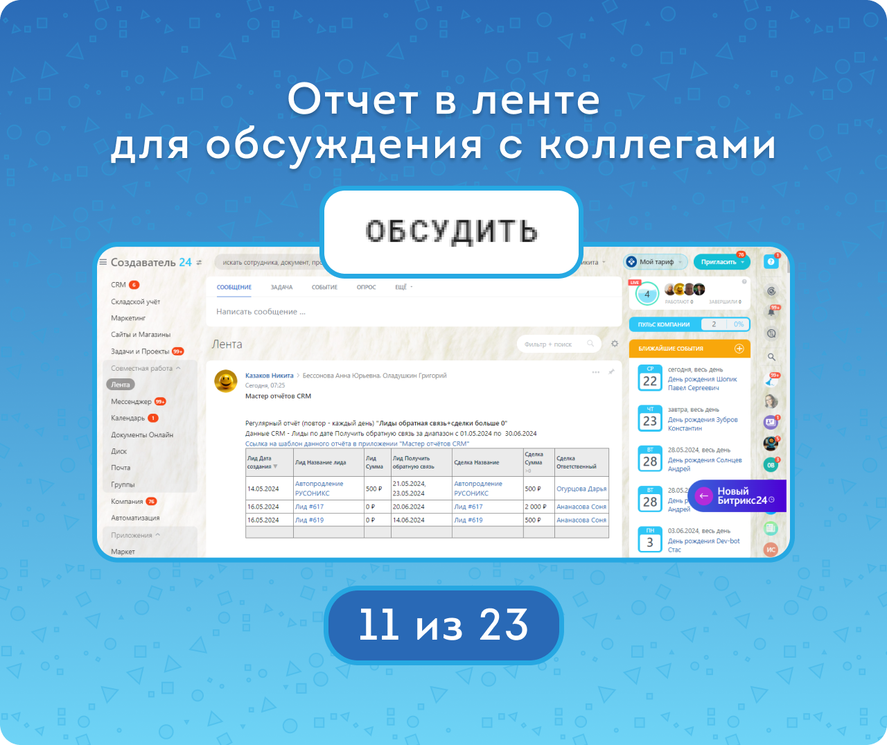 - Настраивать отчеты для регулярной автоматической публикации в Ленту Новостей.