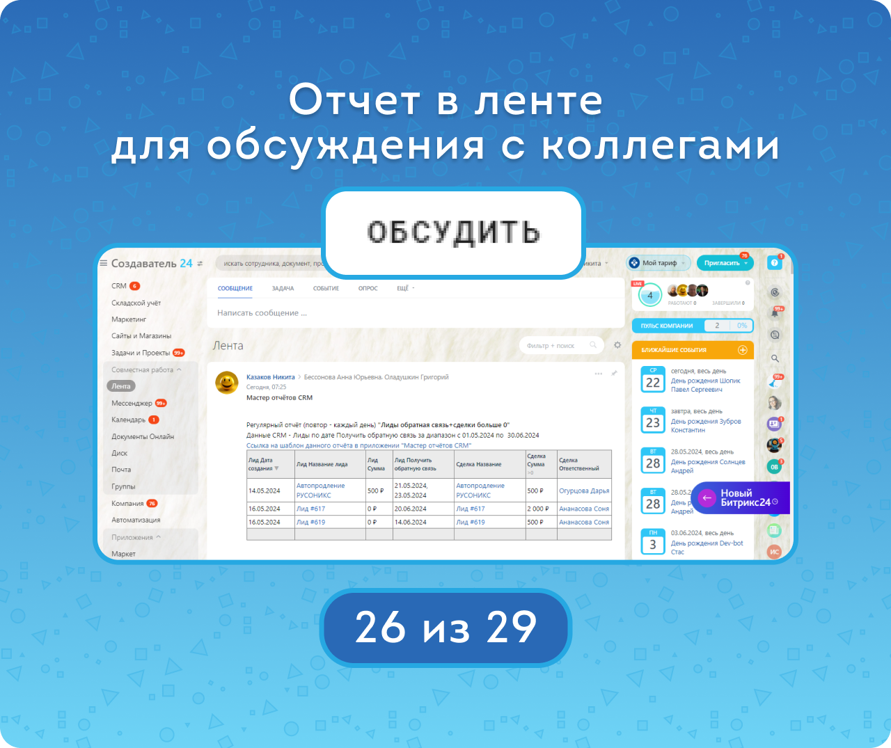 - Опубликовать отчёт в Ленте новостей для обсуждения с коллегами.