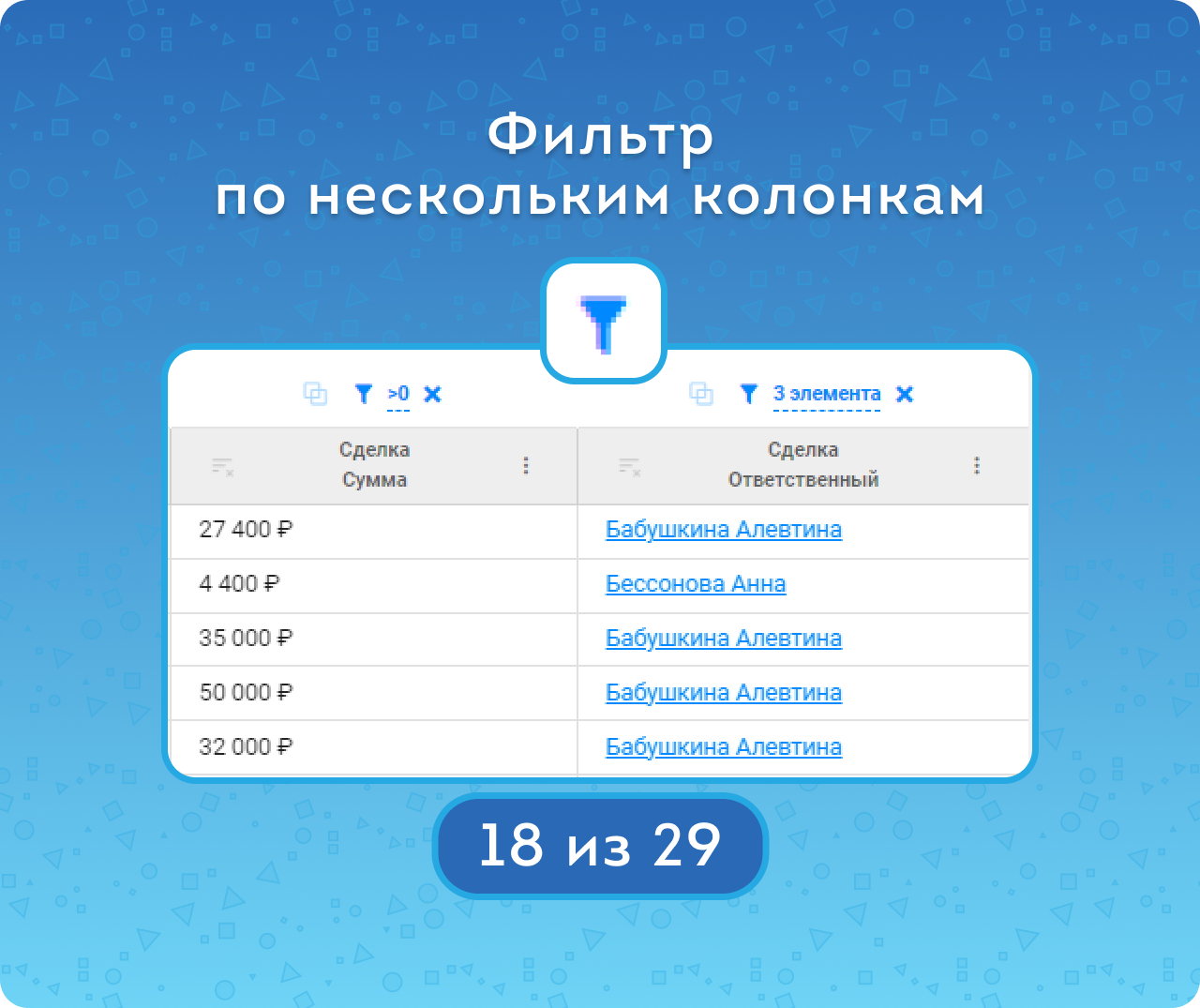 - Комбинировать поля и колонки так, как понадобится, а также фильтровать и сортировать любые данные.