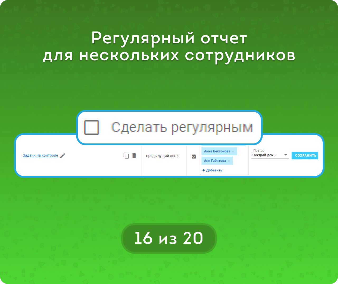 Кроме того, шаблон можно сделать регулярным для публикации в ленту Новостей. Администратор выбирает: какой шаблон будет публиковаться, кто будет его получать и с какой периодичностью. А руководитель регулярно получает нужную ему сводку информации.Почитать про особенности и настройки регулярного отчета можно тут.