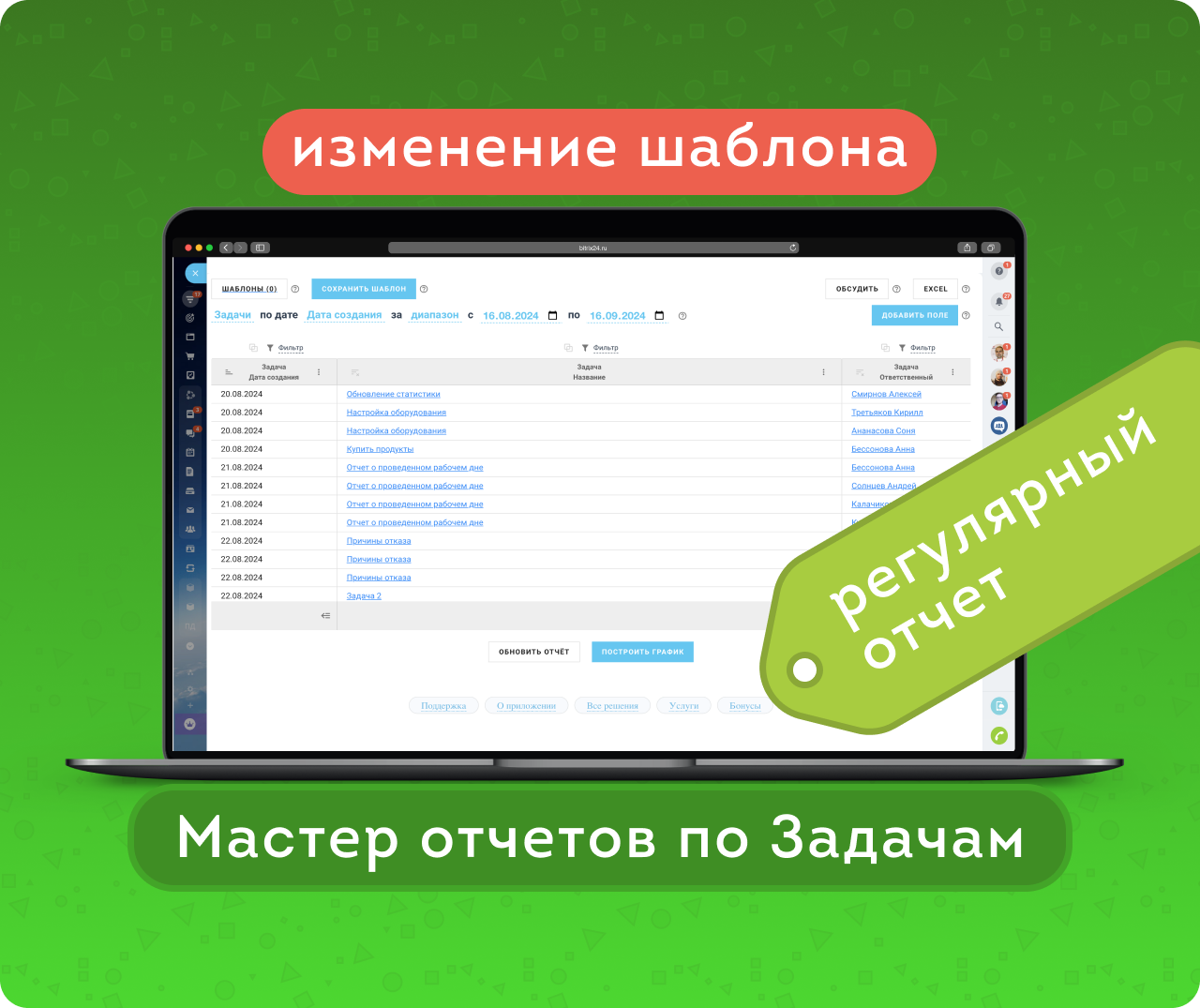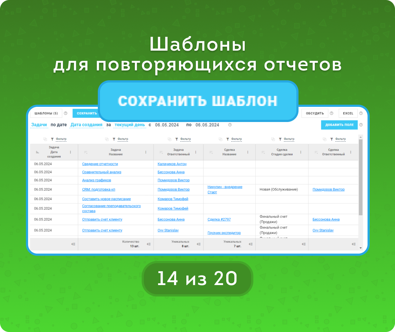Любой отчет можно сохранить как шаблон с заданными полями, сортировкой и фильтрами. Название шаблона легко поменять, а также внести в него изменения.