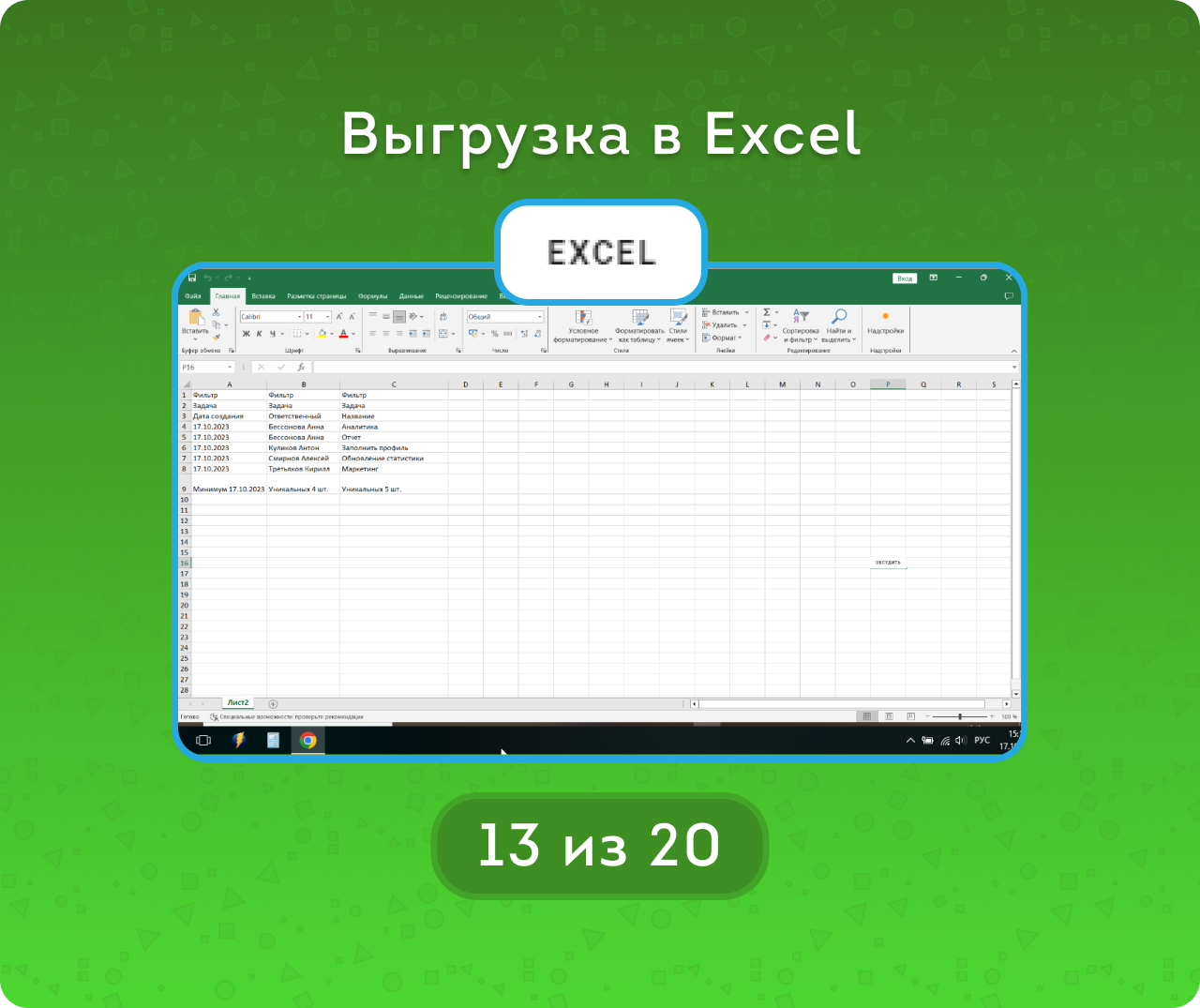 Выгружать готовый отчёт в Google Таблицы и Excel.