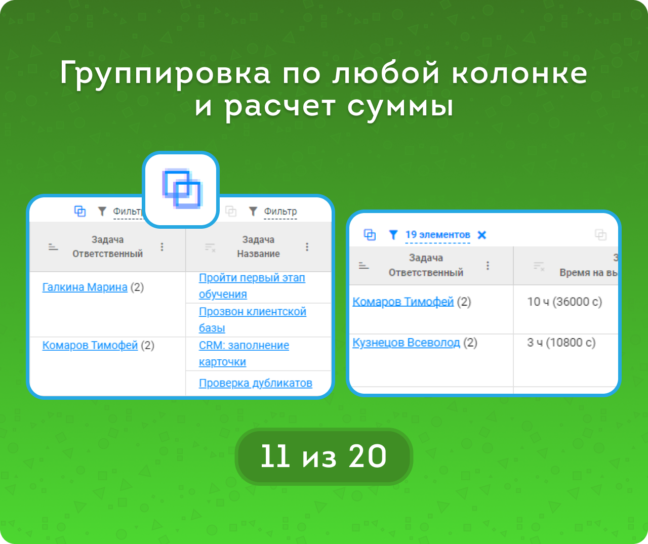 Для того, чтобы проанализировать эффективность команды в разрезе закрытых задач, выберите поля: Название, Ответственный и Статус. Выберите фильтр в поле Статус «Завершена» и примените группировку по Ответственному. Вы увидите, кто из ваших сотрудников закрыл больше всего задач за период.