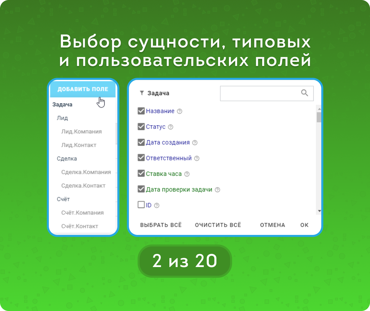 - Выбор полей как по Задачам, так и по связанным с ними сущностям CRM (Сделки, Лиды, Счета). Не только типовых, но и пользовательских.