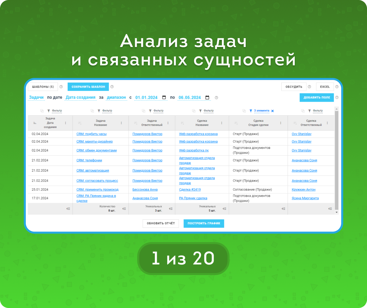 Гибкие отчёты по Задачам, Компаниям и Контактам; Графики.