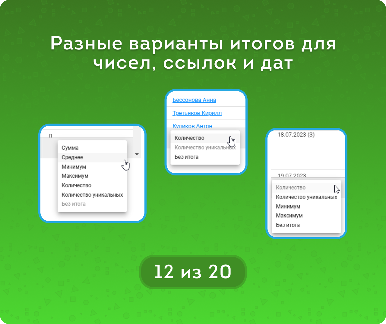 Выбор итогов в зависимости от типа поля: Сумма, Минимум, Максимум, Среднее, Количество, Количество уникальных.