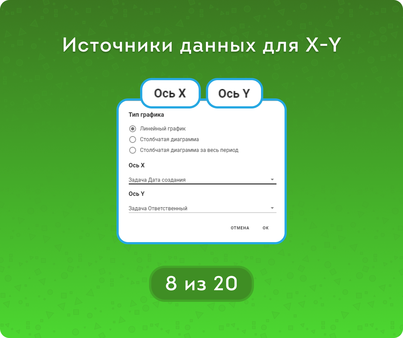 Для того, чтобы выделить в вашем отчете самое важное — используйте графики. Так воспринимать информацию станет проще. Кнопка «Построить график» находится под таблицей, можно выбрать тип графика и подходящие поля для осей Икс (любая дата) и Игрек (числовые и списочные поля).