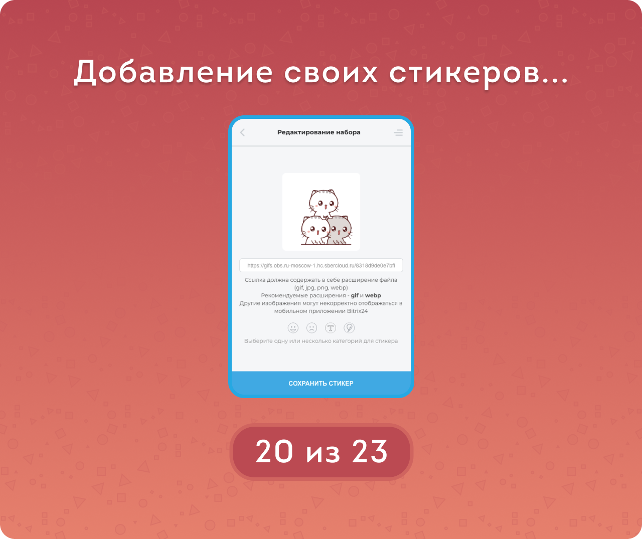 Для того, чтобы стикеры корректно отображались в мобильном чате Битрикс24 — лучше использовать gif и webp. При этом сами файлы могут находиться где угодно — на диске Битрикс24, хостингах и так далее.
