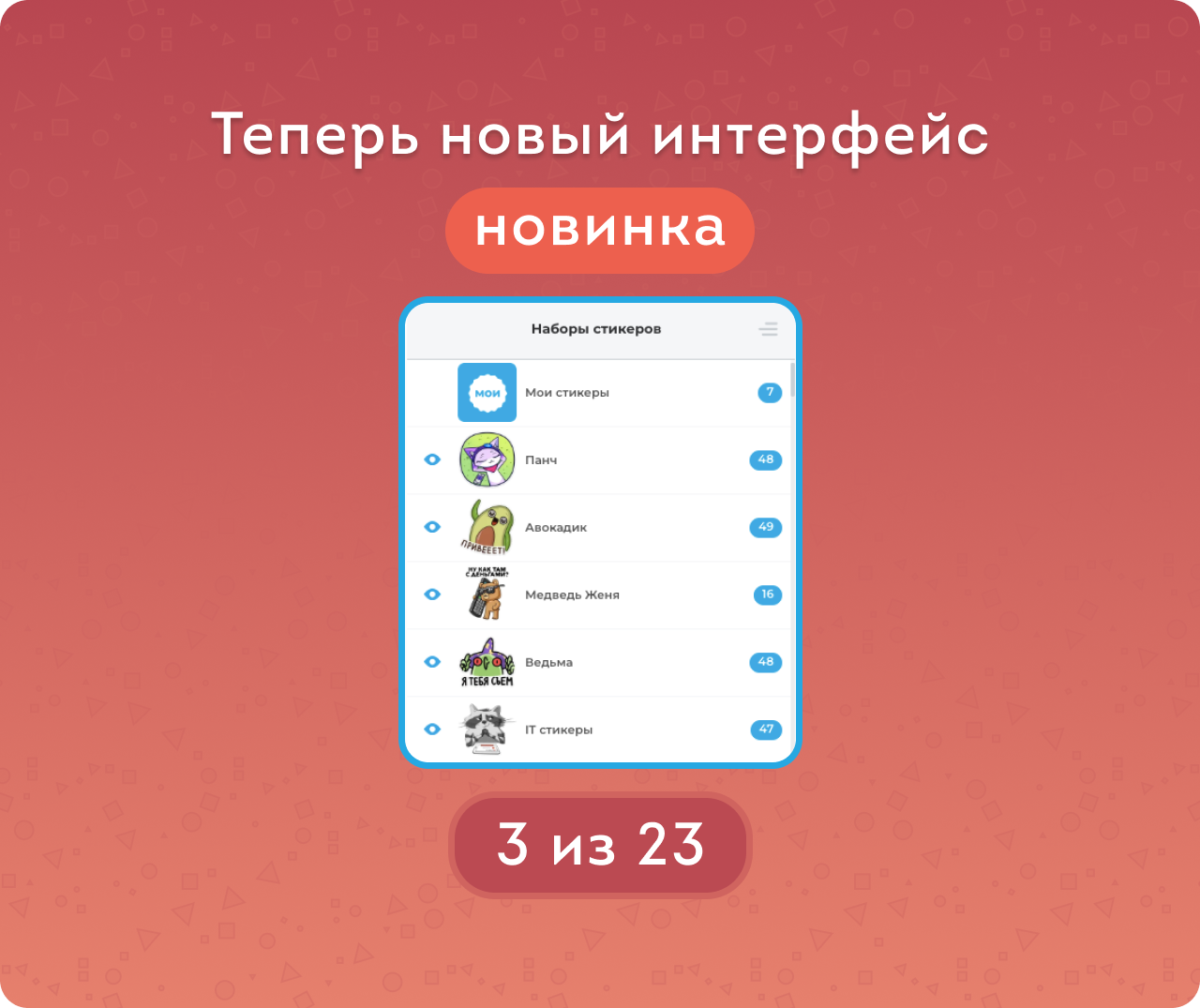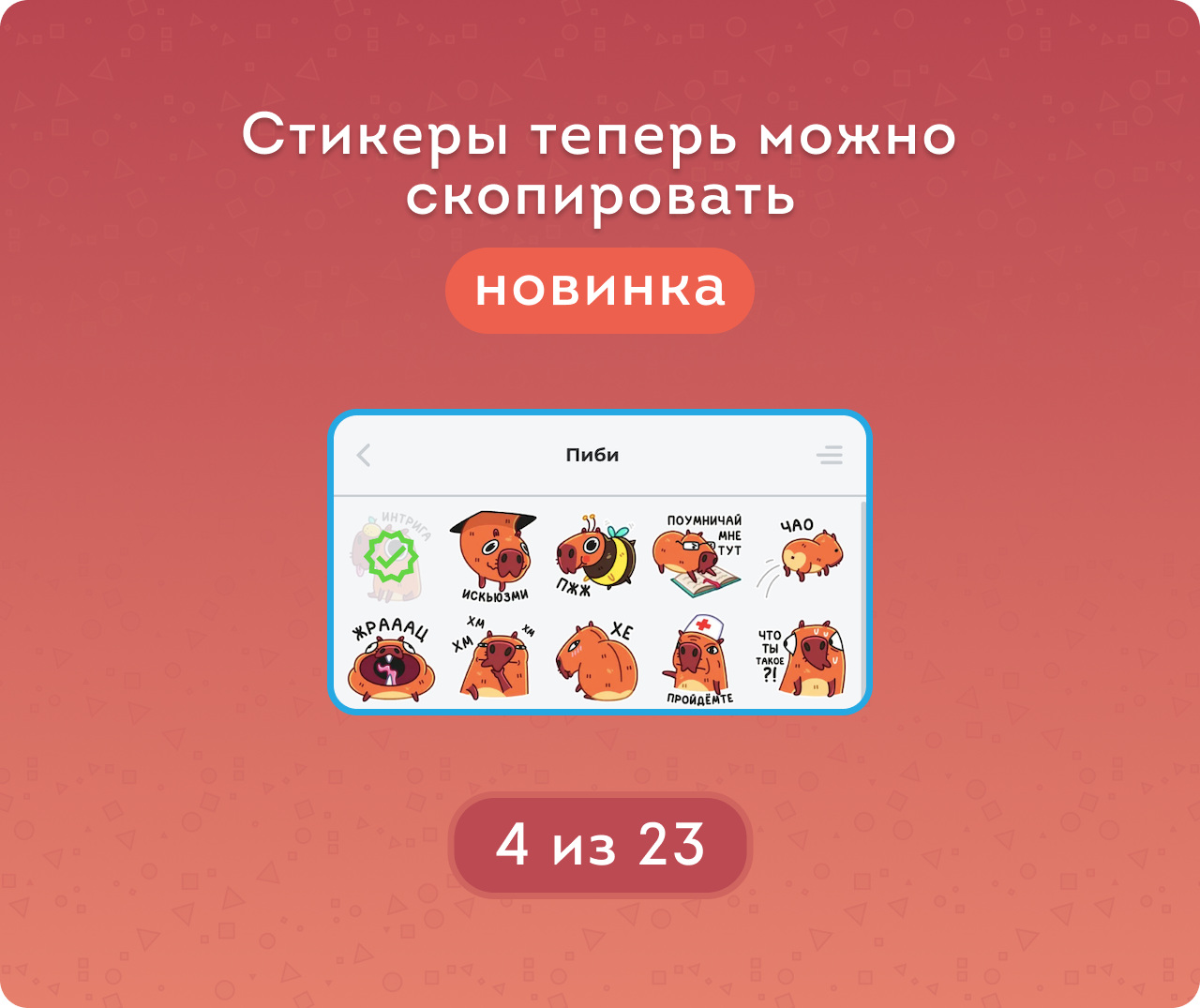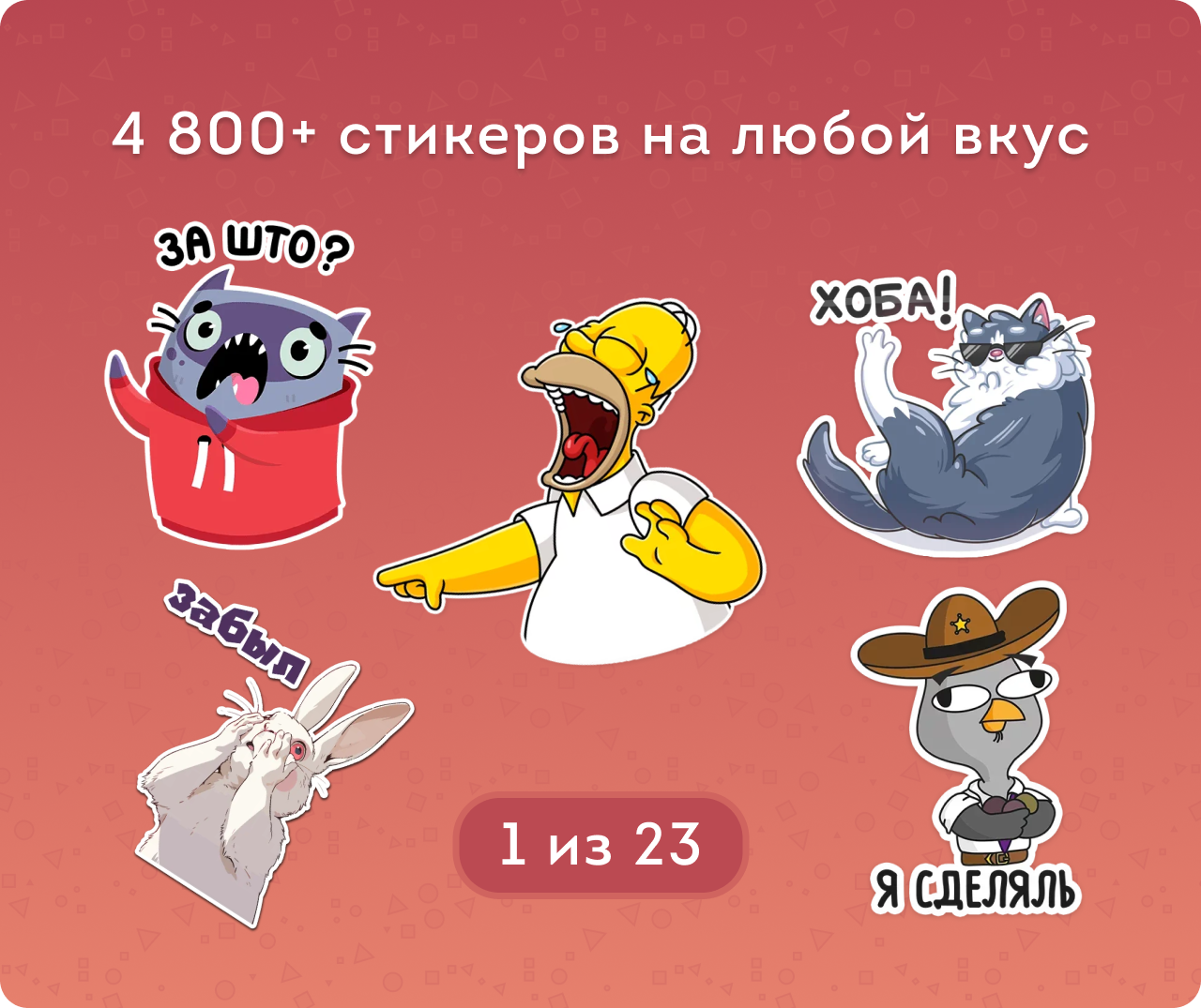 Стикеры как в Telegram — разнообразят общение с коллегами и запоминаются клиентам. 120+ готовых наборов включают в себя больше