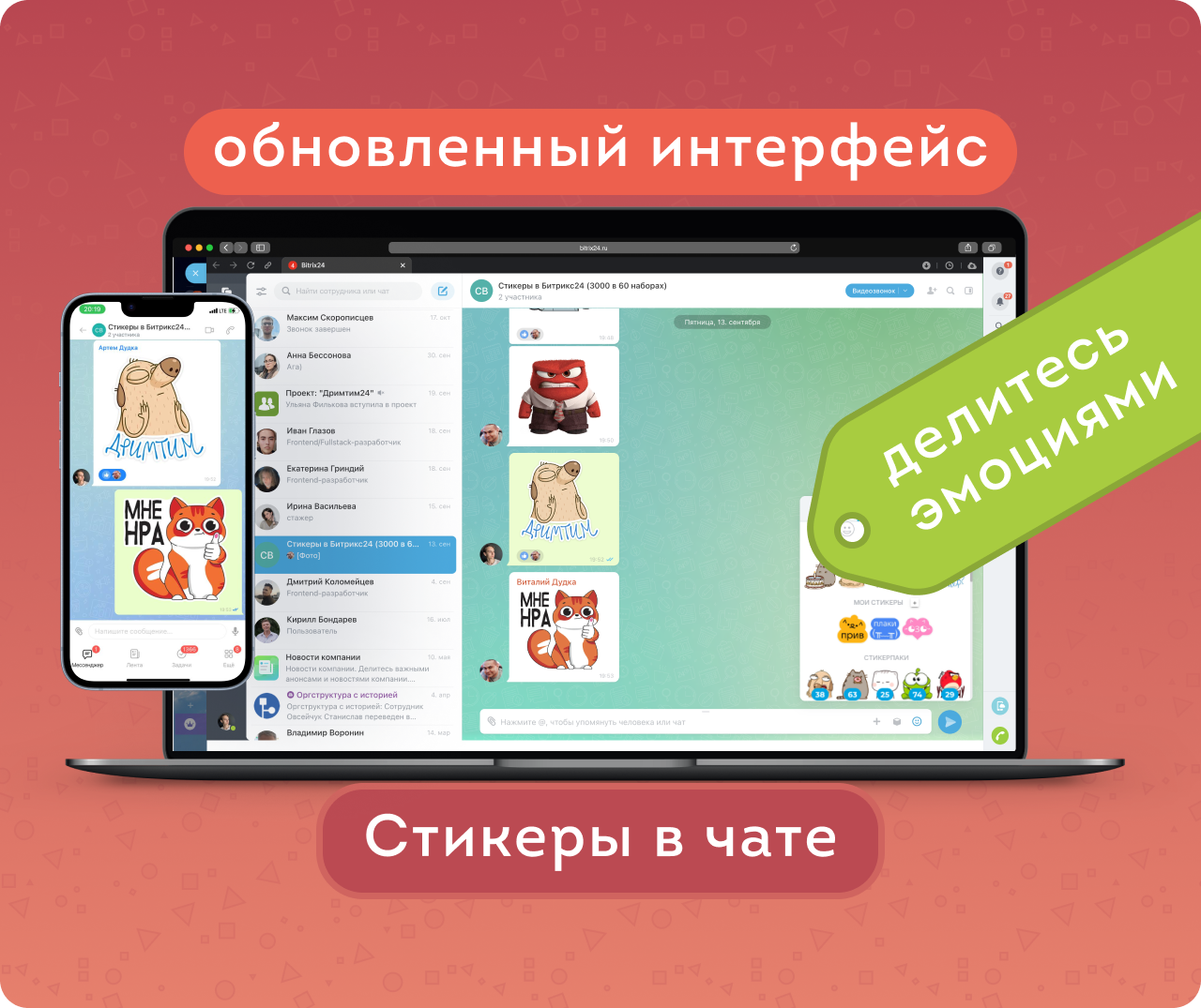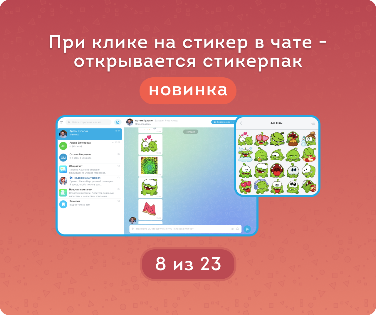 Стикеры в Битрикс24 — отличный способ выразить эмоцию и передать настроение! Выбирайте из 4 800+ стикеров — и разнообразьте свои чаты!