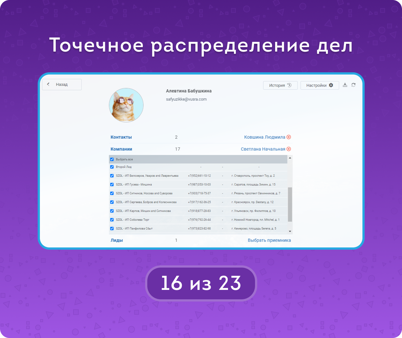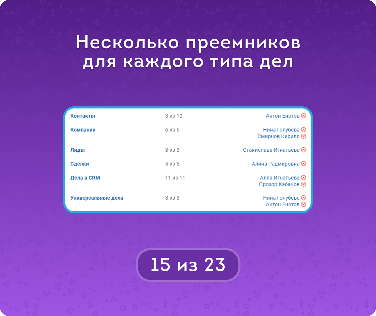 Для каждой сущности можно выбрать сотрудника, которому будут переданы дела. Например, передать контакты одному человеку, лиды другому, а компании — третьему, что очень удобно. Более того, вы можете выбрать сразу несколько сотрудников для передачи. В этом случае дела равномерно будут распределены между выбранными преемниками. Это особенно полезно в B2B-компаниях, где важно, чтобы у клиента всегда был единый ответственный.