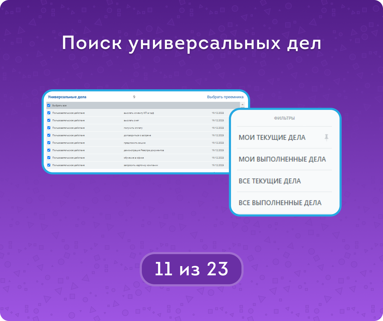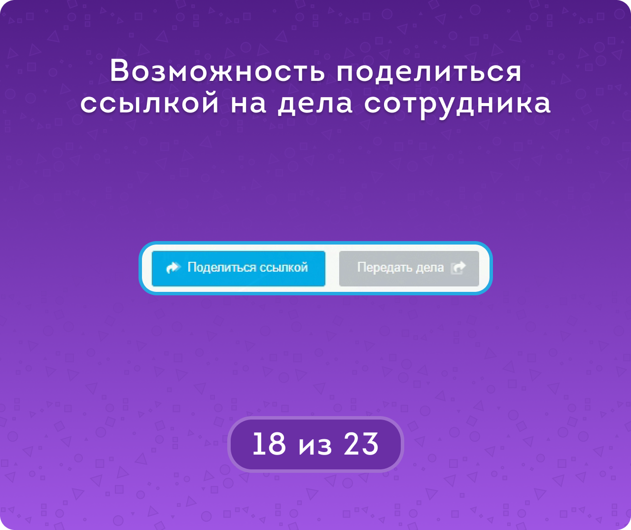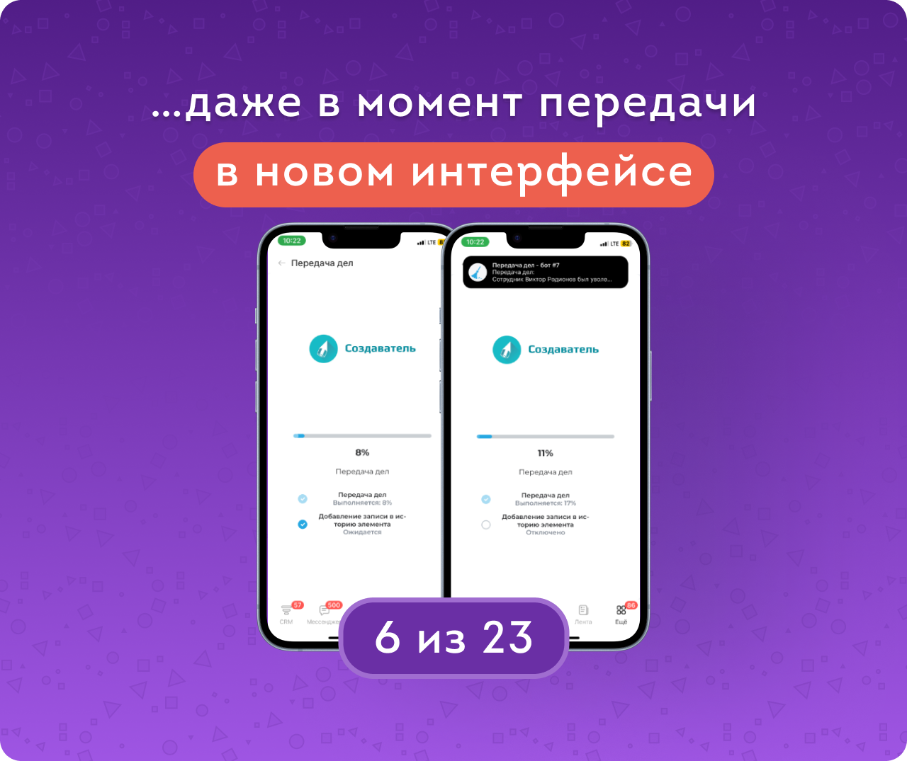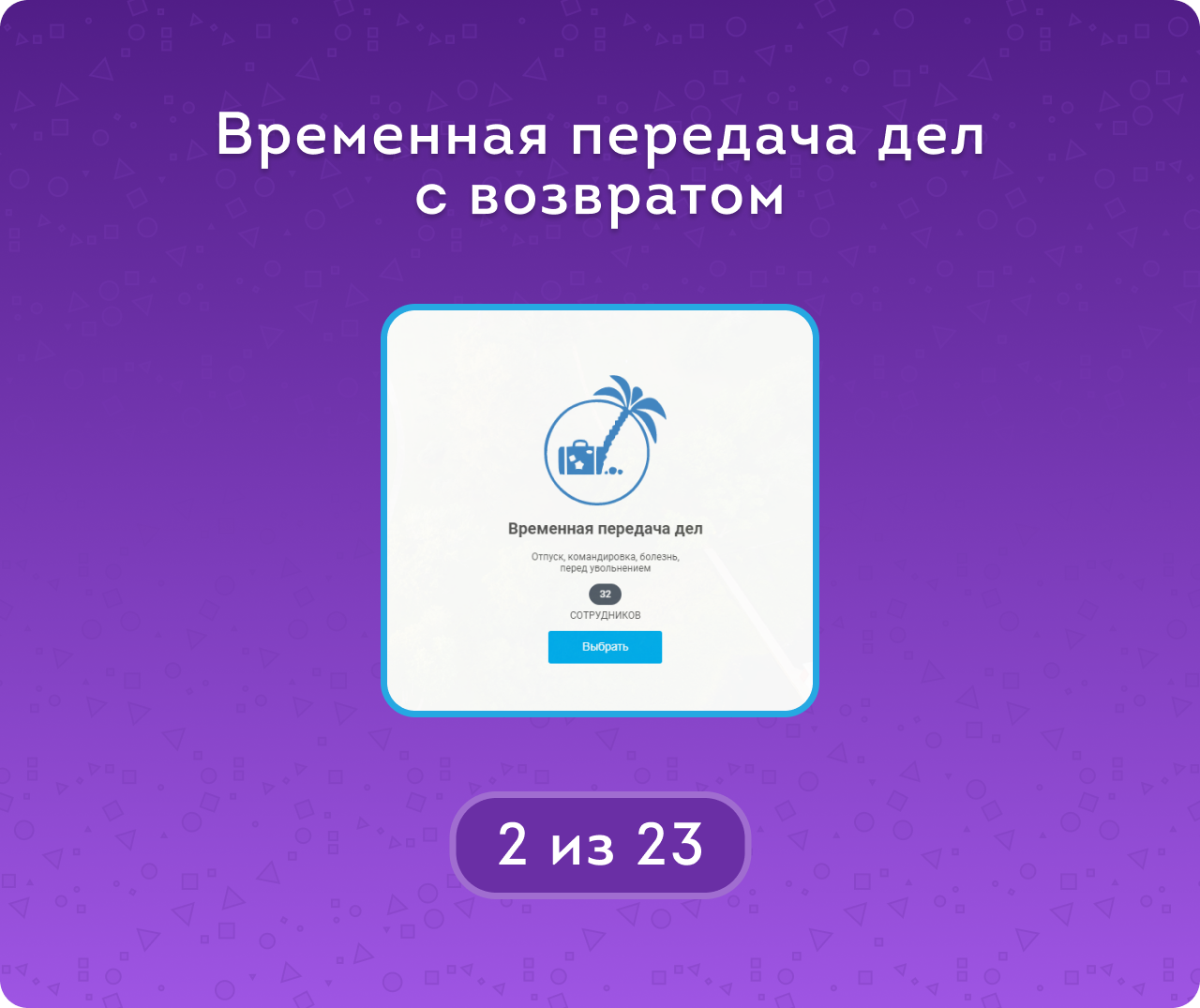 Передача дел — приложение, которое сделает вашу жизнь проще и приятнее, упростив управление задачами и передачу сделок. Решение позволяет автоматически передавать дела уволенных сотрудников и временно отсутствующих коллег. Больше не нужно вручную разбирать незавершенные дела — все можно решить в несколько кликов. Невероятная экономия нервов, времени и денег!