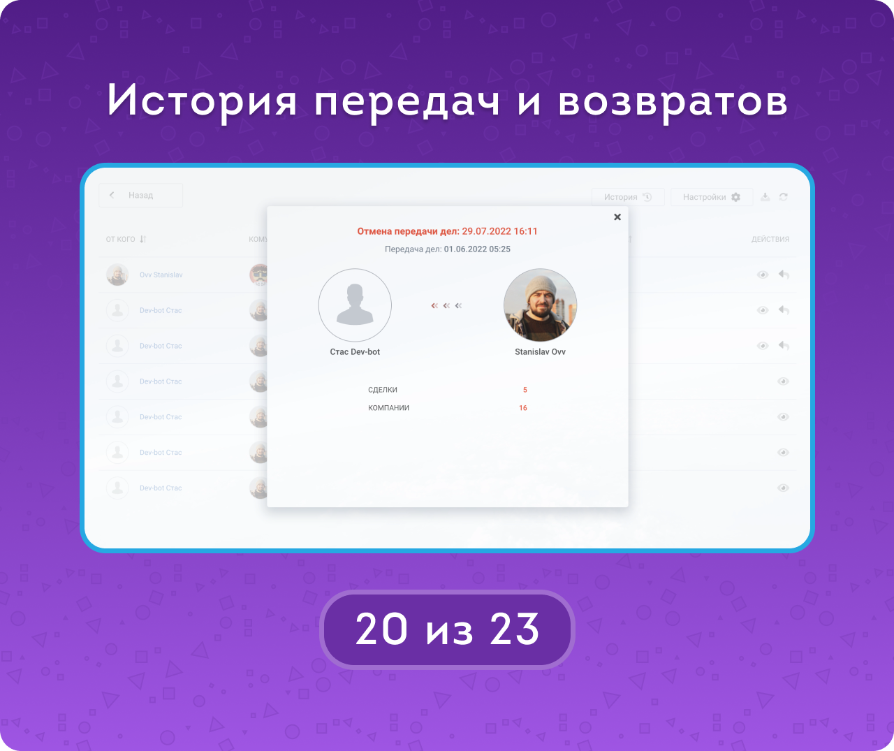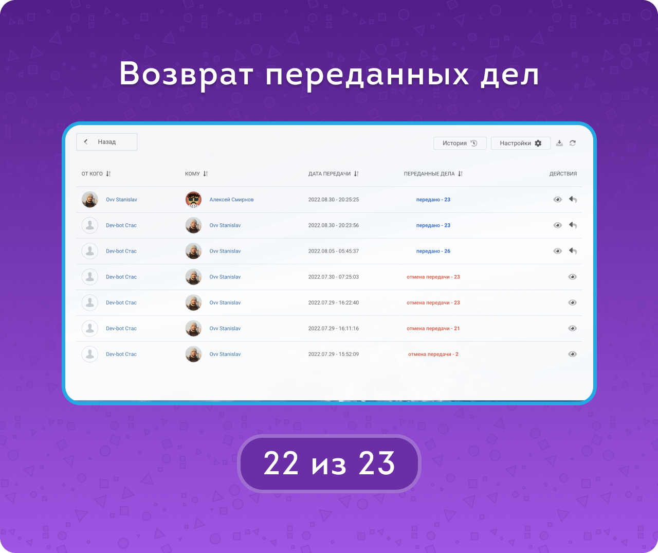 После того как сотрудник возвращается из отпуска, командировки, или выходит с больничного — вы можете одним кликом вернуть временно переданные дела. Для этого нужно открыть Историю. В ней хранится вся информация по передачам и возвратам. В старом интерфейсе доступна сортировка по сотрудникам, дате и количеству переданных дел.