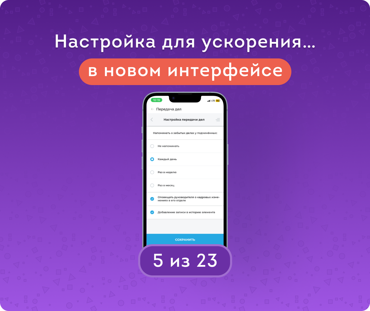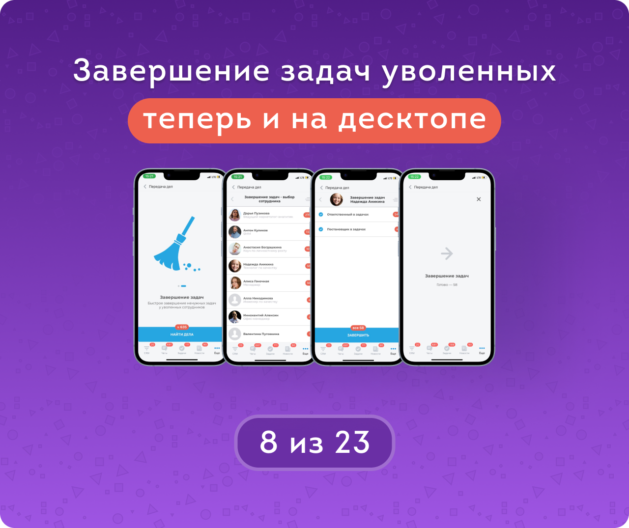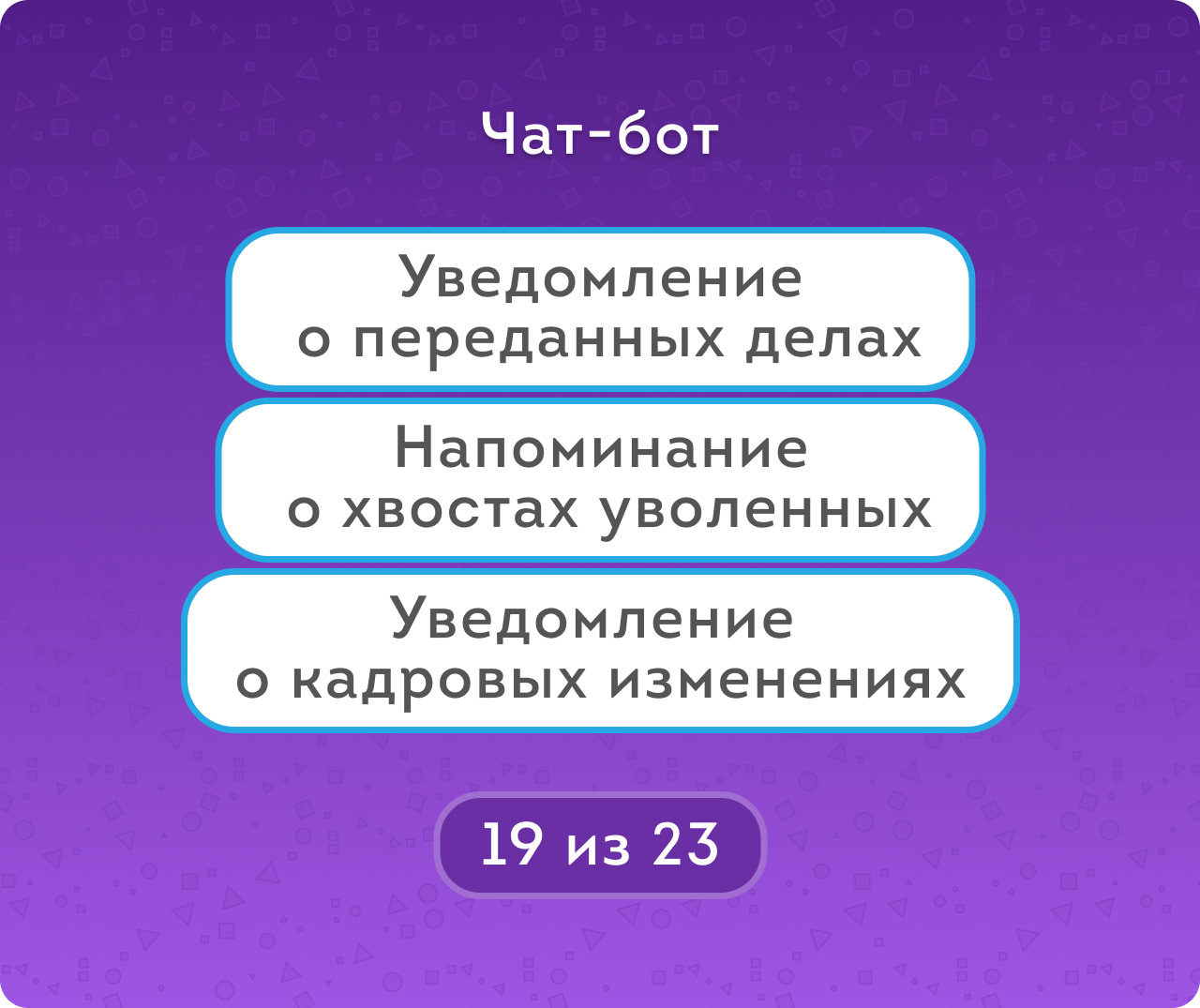 При увольнении сотрудника приложение повторяет напоминания руководителю, пока не будут разобраны все «хвосты». Это помогает избавиться от потерянных дел и поддерживать порядок на портале. Частоту напоминаний можно регулировать в Настройках.