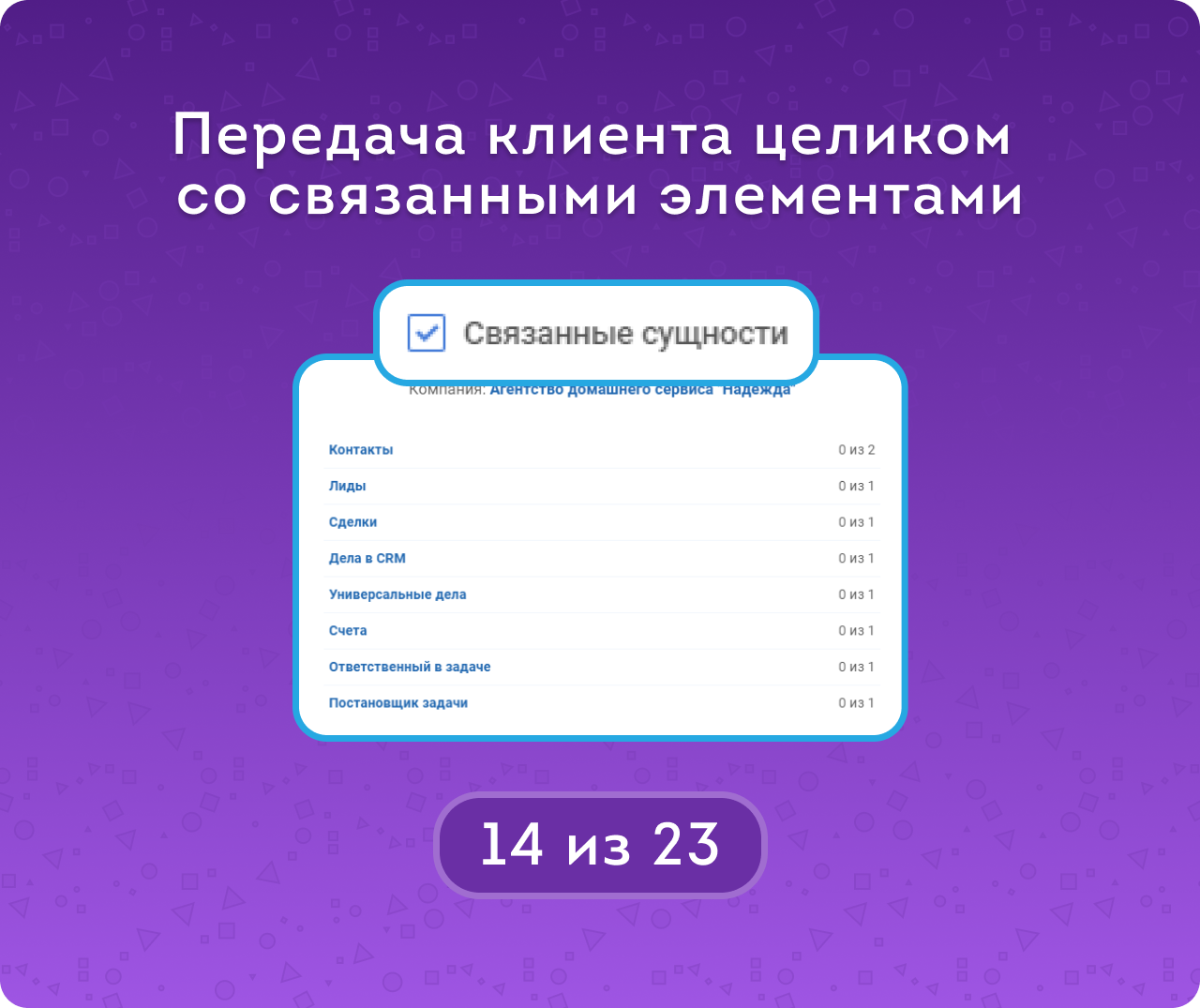 Чек-бокс «Связанные сущности» позволит передать родительские сущности компания и контакт вместе со всеми дочерними. При этом не учитывается текущий ответственный, и сущности передаются полностью, вместе с родительской.