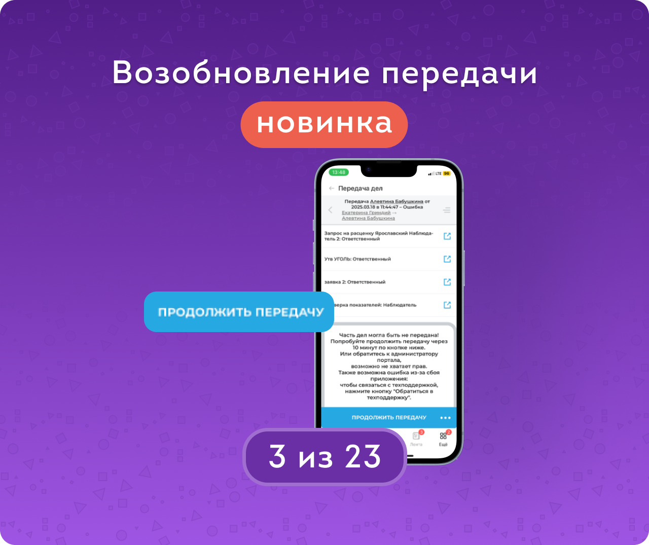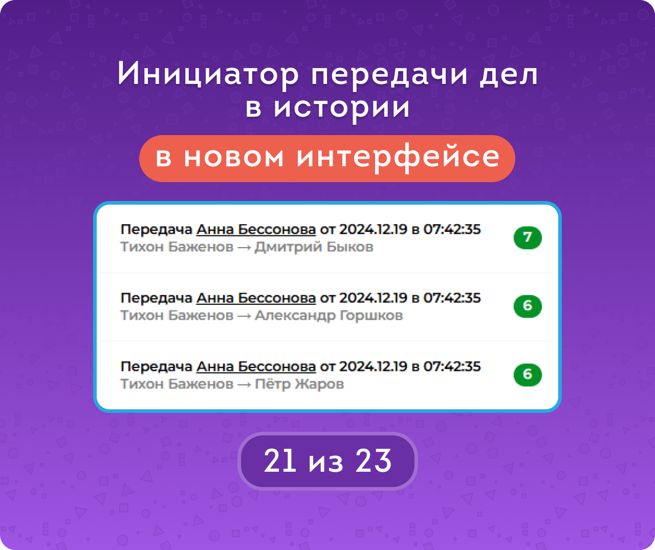 В новом интерфейсе Истории доступна информация об инициаторе передачи — том сотруднике, который запустил процесс. Кроме того, визуально разделяются успешно переданные дела, возвращенные и прерванные сессии (например, отключился интернет и дела передались не до конца). В этом случае можно их вернуть и попробовать снова.
