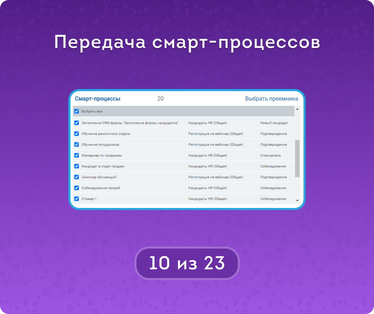 В строке поиска введите Фамилию, Имя или должность сотрудника — и приложение в несколько секунд сформирует список компаний, лидов, сделок, счетов, смарт-процессов и тд. Выбираем преемника или преемников и передаем дела.