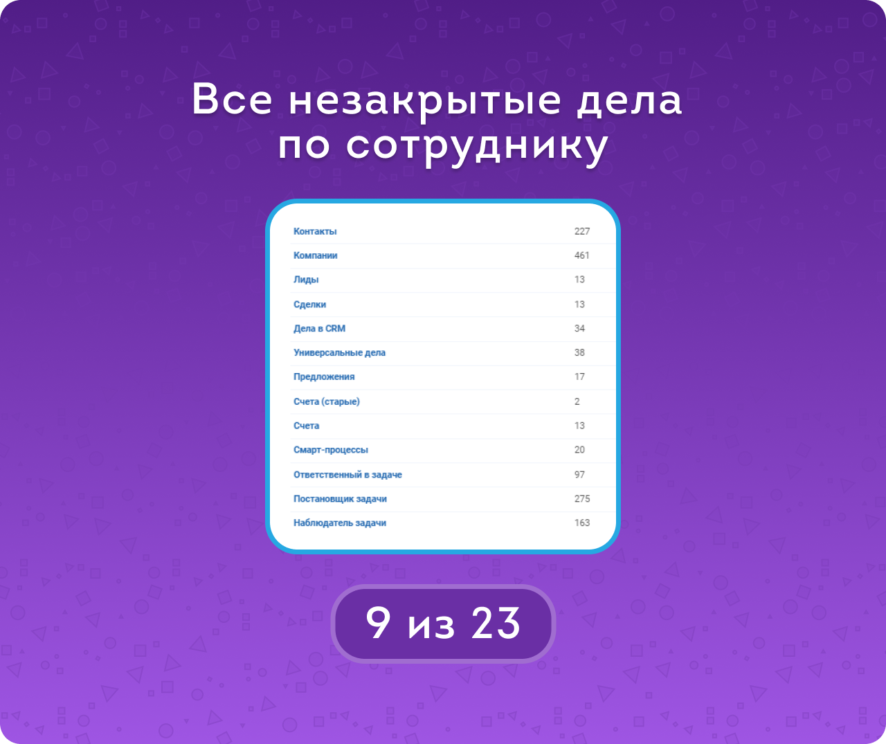 Ваши данные в безопасности! 1. Учитываются права текущего пользователя. Администратор портала видит все дела, руководители и сотрудники — в зависимости от настроенных ролей и прав доступа в CRM на чтение и изменение сущностей. 2. Данные обрабатываются только в вашем браузере и, в отличие от аналогичных приложений, не передаются на сторонние сервера. |