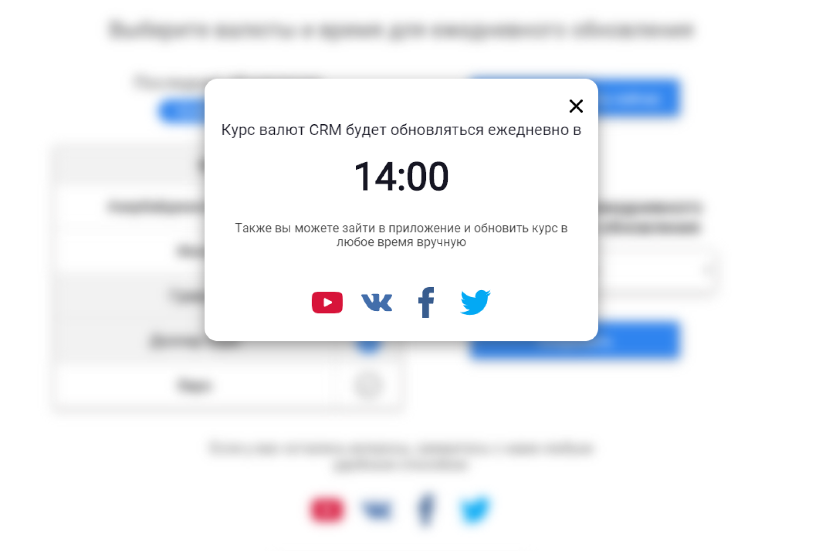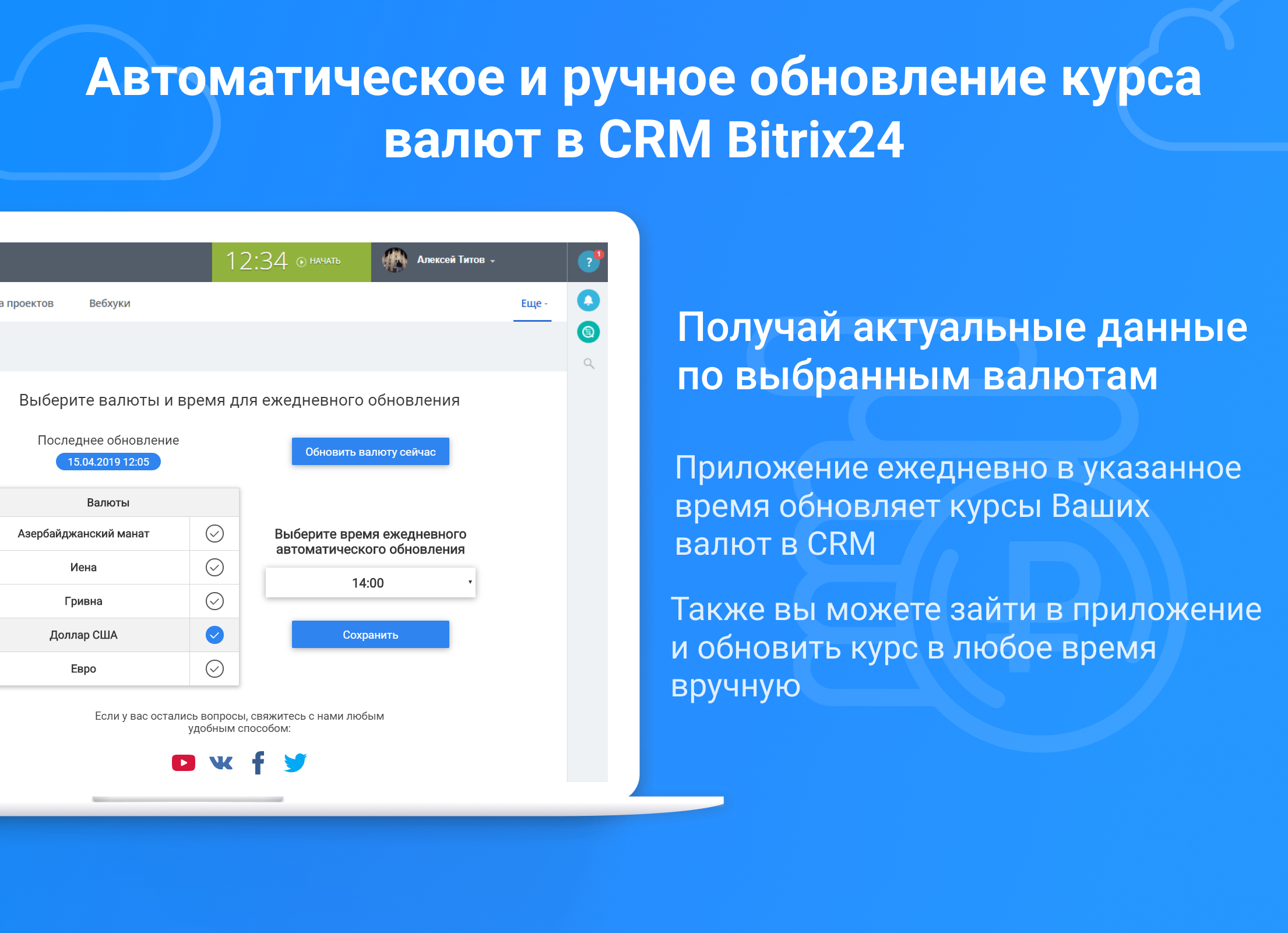 Приложение ежедневно в указанное время обновляет курсы Ваших валют в CRM по данным ЦБ РФ. Валюта обновляется по Московскому времени Также вы можете зайти в приложение и обновить курс в любое время вручную.