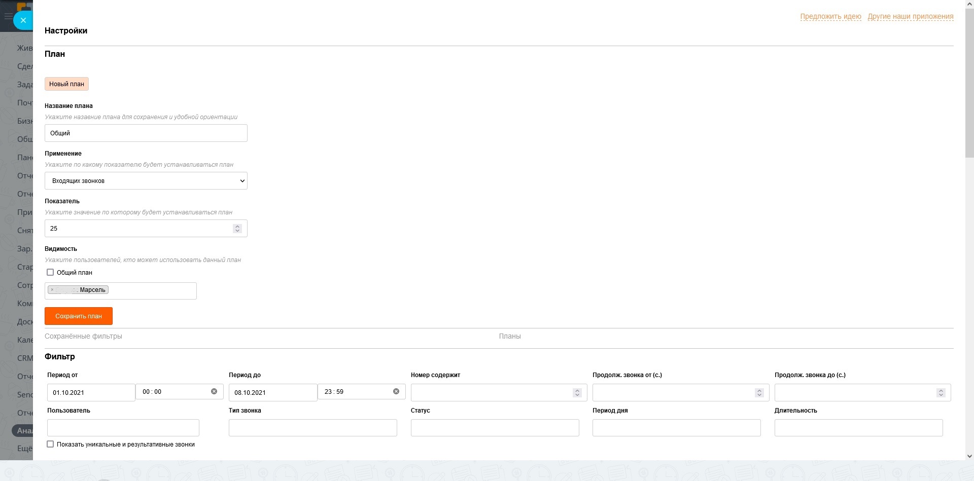- Вы сможете установить для сотрудников call-центра (одного, группы или всех) план, то есть норму по выполненным звонкам. Если он есть готовый – отлично. Если его ещё нет, то данные статистики помогут его сформулировать. Это может быть количество звонков или их продолжительность. Например, обработать 80% поступивших звонков за первые 20 секунд. После чего приложение будет показывать процент выполнения установленного плана.