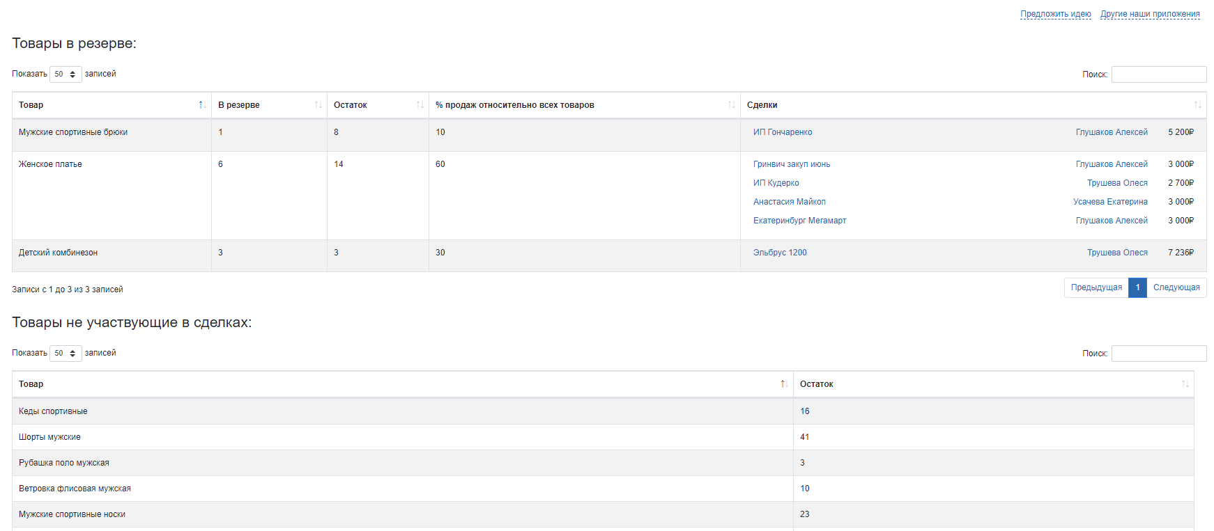Получите оперативную информацию по всем товарам, которые в данный момент находятся в резерве. Приложение просмотрит все сделки в работе и выведет список всех товаров, которые в данный момент участвуют в этих сделках.
