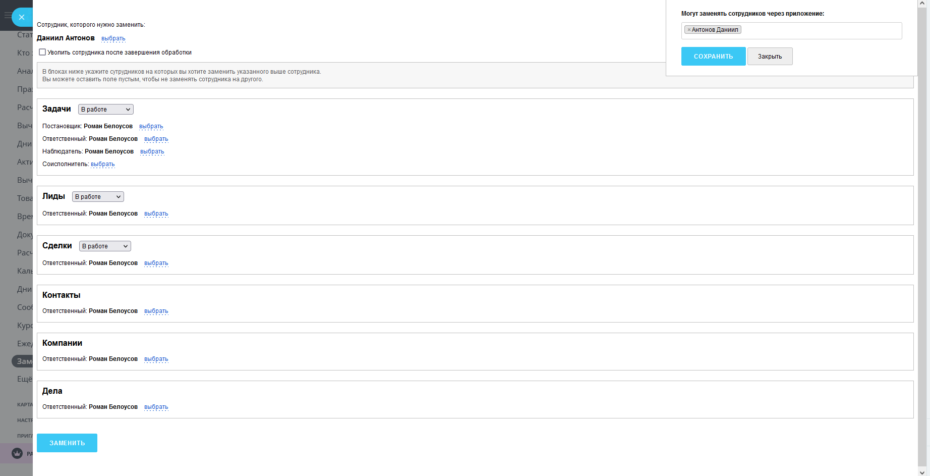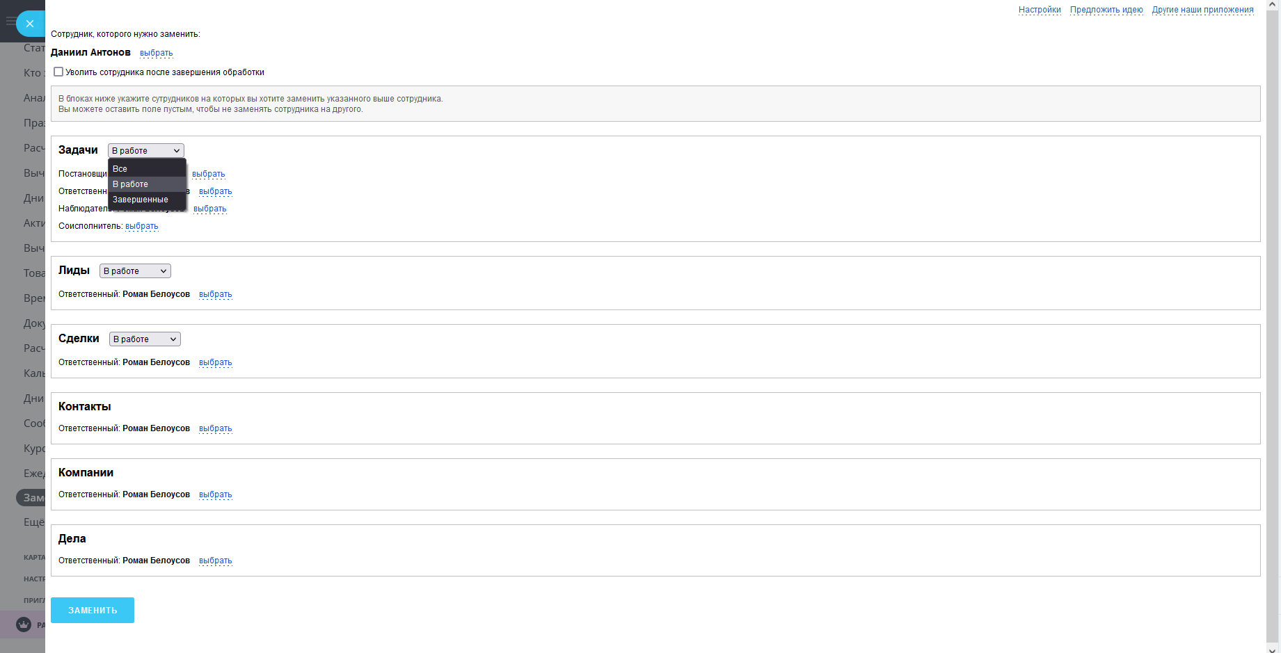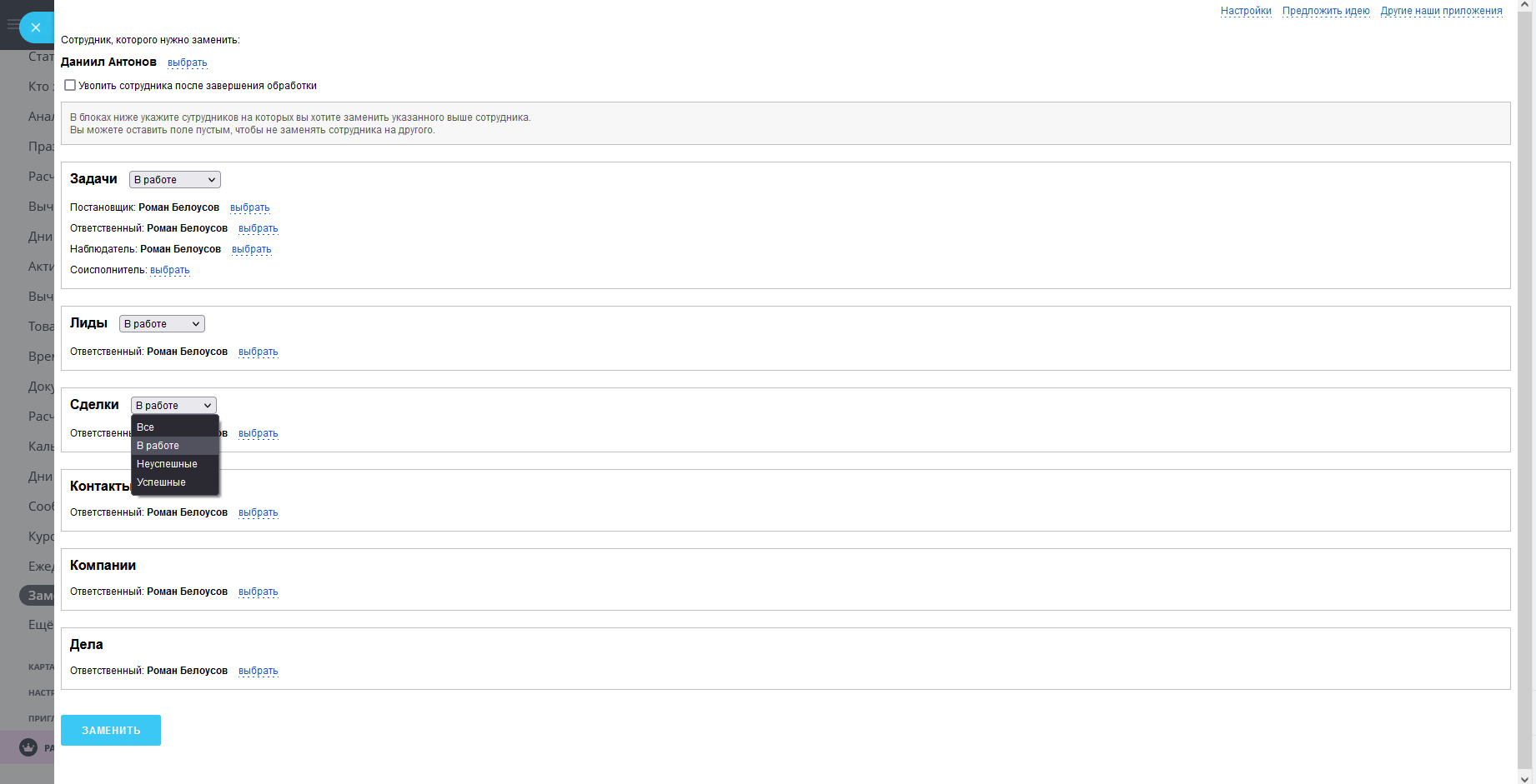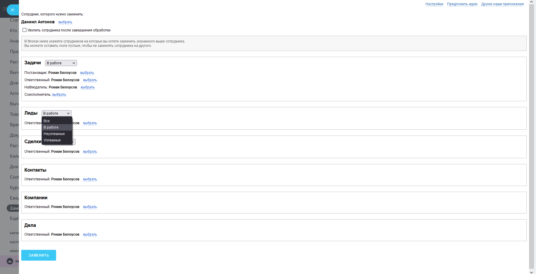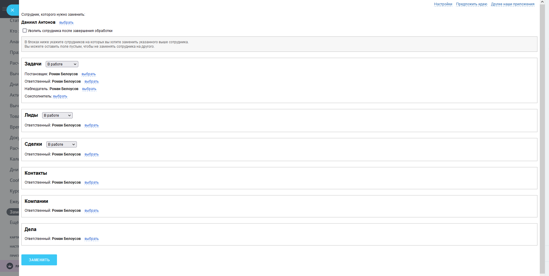 Приложение позволяет массово поменять ответственного сотрудника в лидах, сделках, контактах, компаниях, делах и задачах.