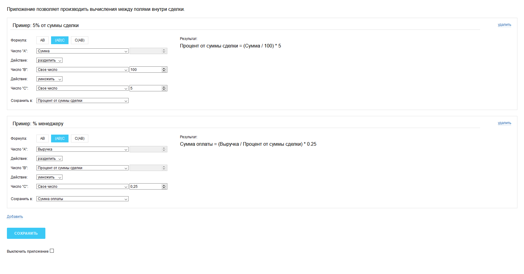 Создайте свои формулы для любого поля в сделке. Расчеты можно сделать на основе полей сделки и своих коэффициентов.