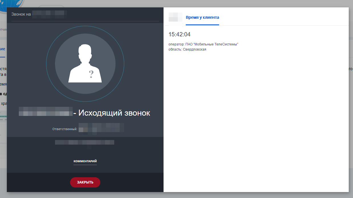 В карточке звонка автоматически выводится время у клиента на одноименной вкладке.Также там выводится информация об операторе абонента и название его региона.