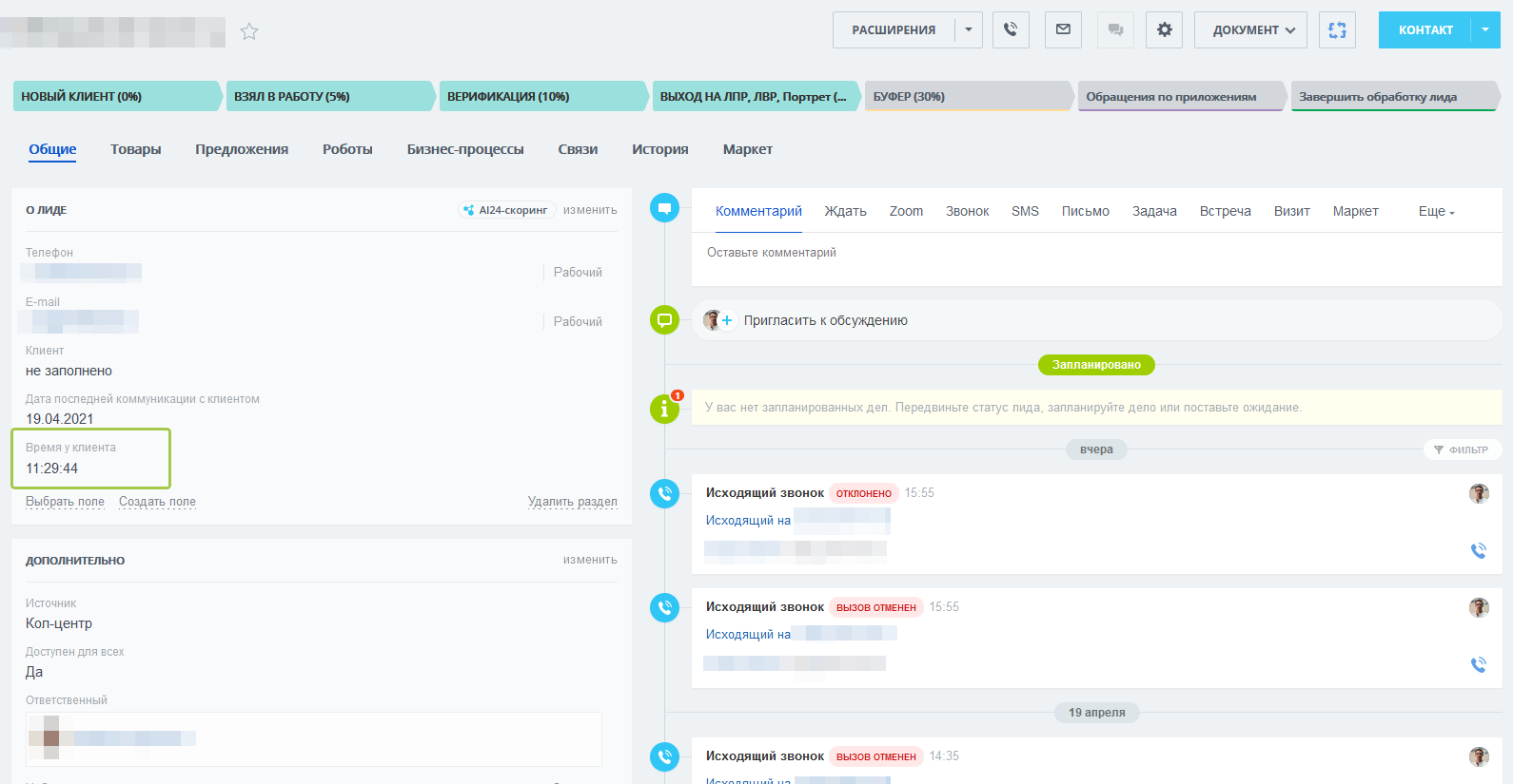 В сущностях Лид, Контакт, Компания и Сделка добавлено поле "Время у клиента", которое показывает текущее время клиента, определенное по его номеру мобильного телефона, заведенного в карточке Лида/Компании/Контакта в системном поле "Телефон". Если телефонов несколько, то приоритет отдается телефону, у которого указан тип "Мобильный".