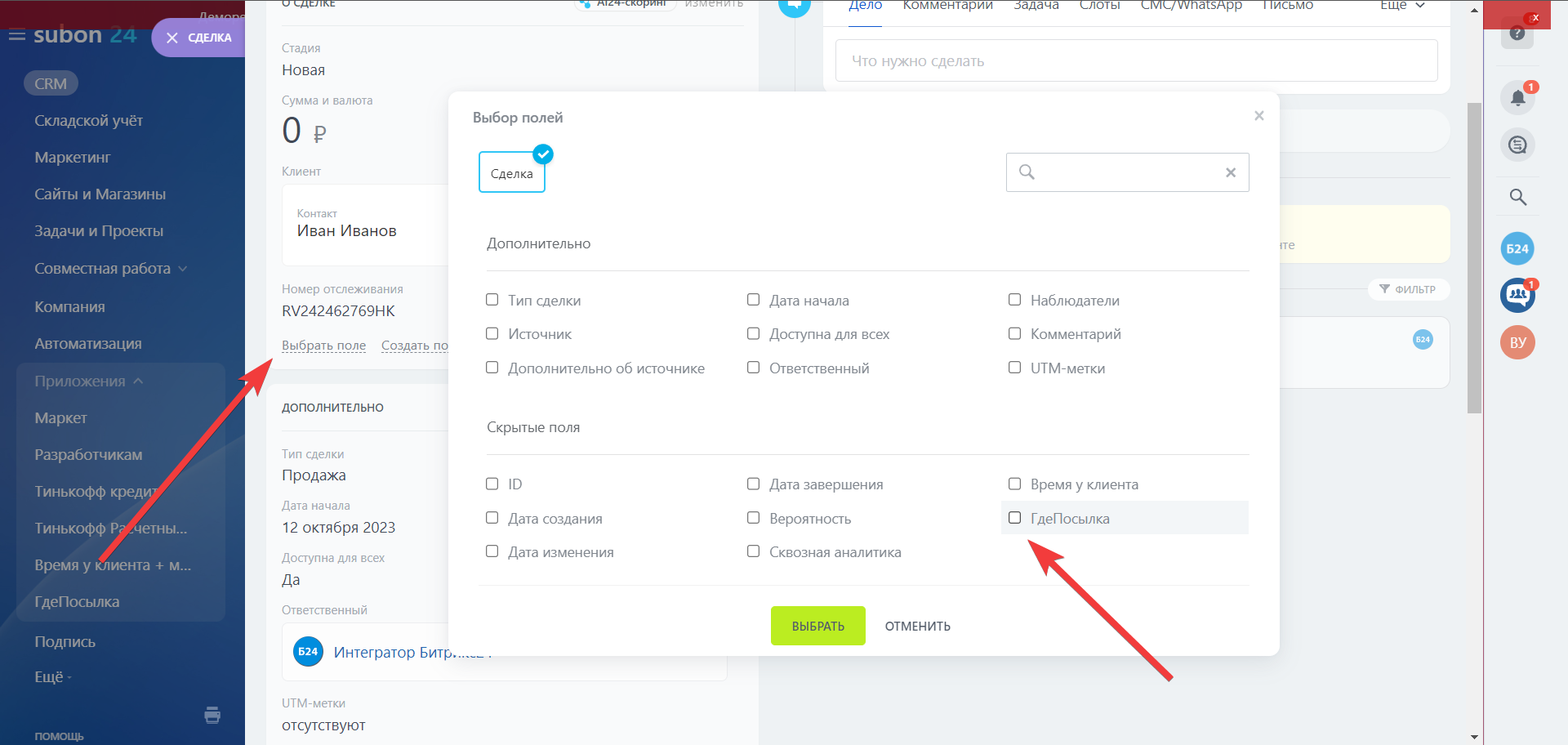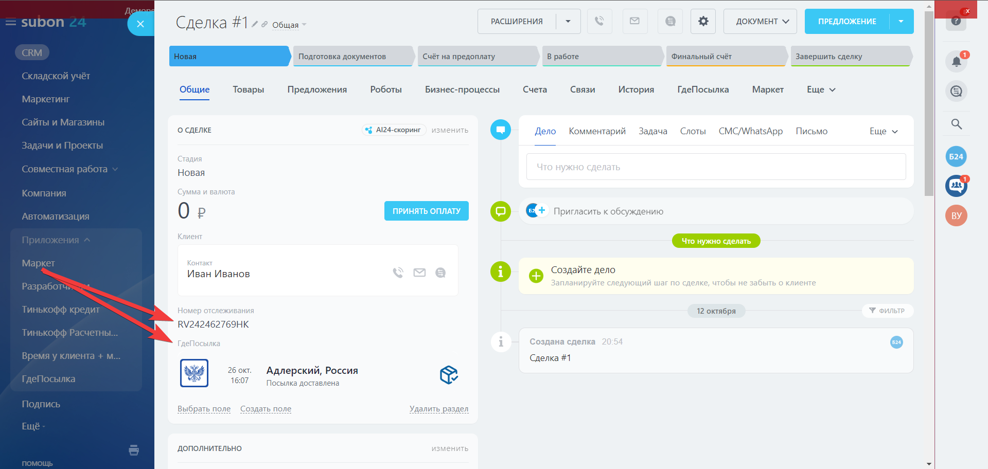 - Связка с сделками: пользователи могут привязать свою посылку к сделке в Битрикс24, чтобы всегда иметь доступ к актуальной информации о доставке.