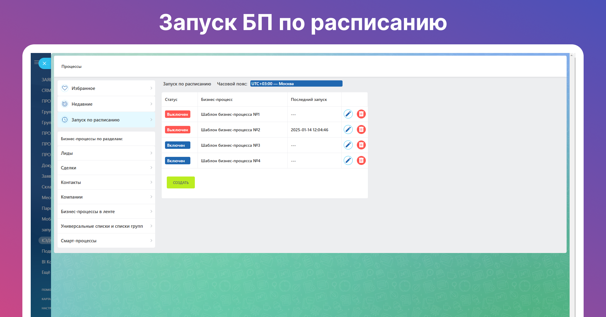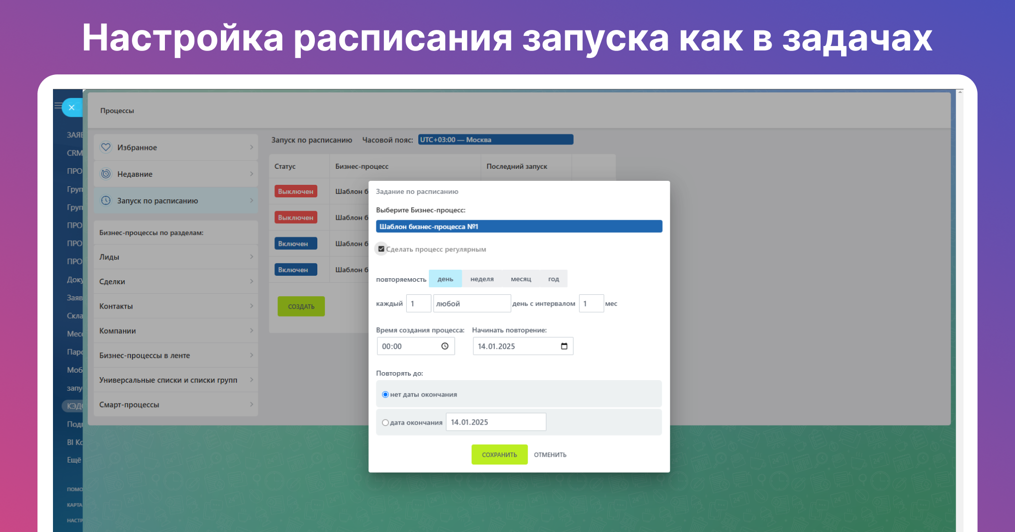 - Настройка регулярных запусков бизнес-процессов для выполнения повторяющихся операций на основе заранее заданного расписания.