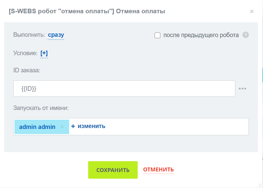 Робот позволяет автоматически отменить оплату заказа в случае выполнения заданных в настройках условий