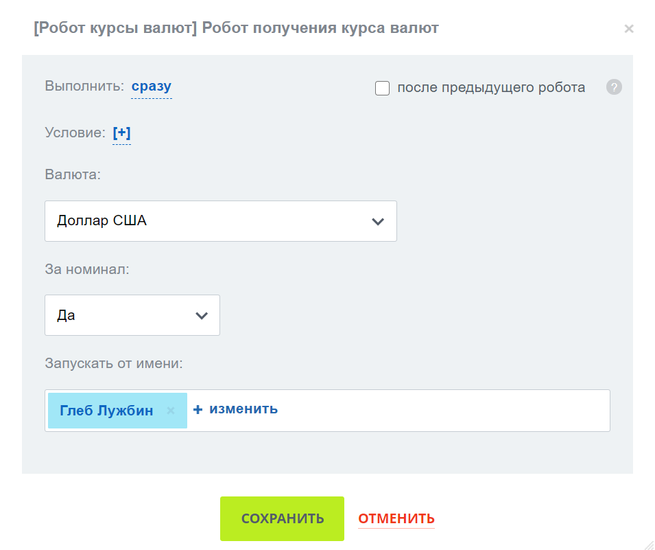 Робота необходимо поместить на нужную стадию воронки продаж и выбрать интересующую вас иностранную валюту. После выполнения запроса робот возвращает актуальный курс указанной валюты к рублю.