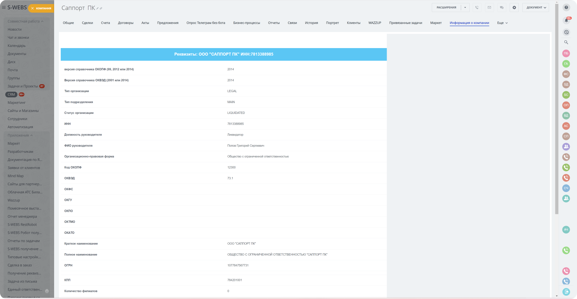 - Карточка компании со всеми данными с автозаполнением реквизитов Битрикс24.