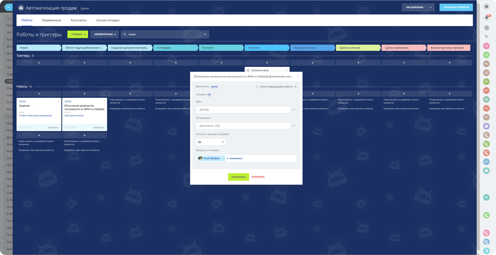 В комплекте робот для поиска компаний в Битрикс24 по ИНН. Робот поиска банка по БИК. Также робот для заполнения реквизитов.
