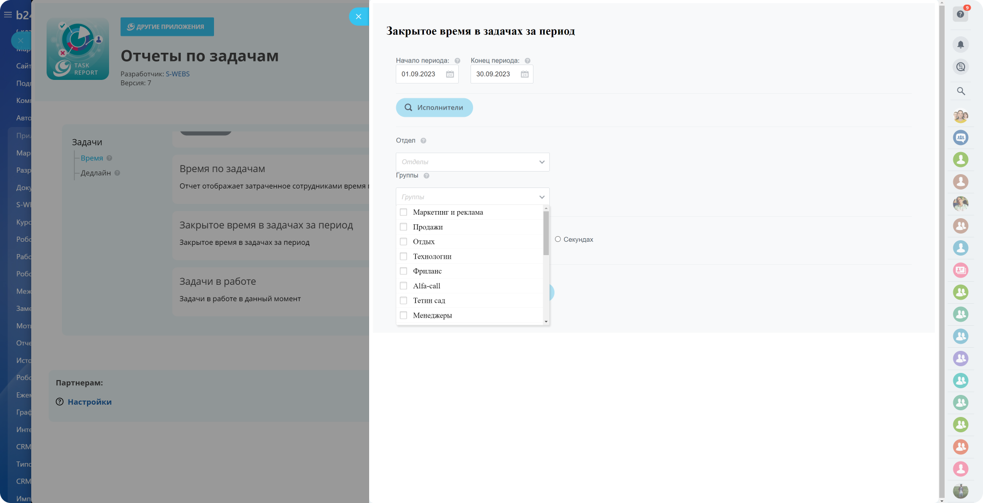 - Отчет о затраченом времени в задачах за период