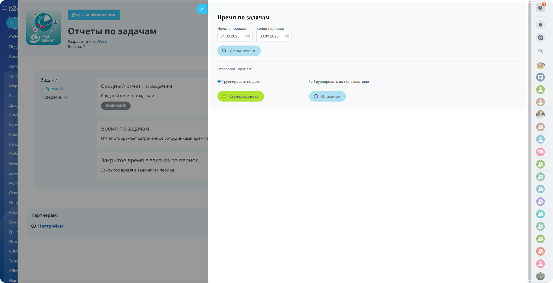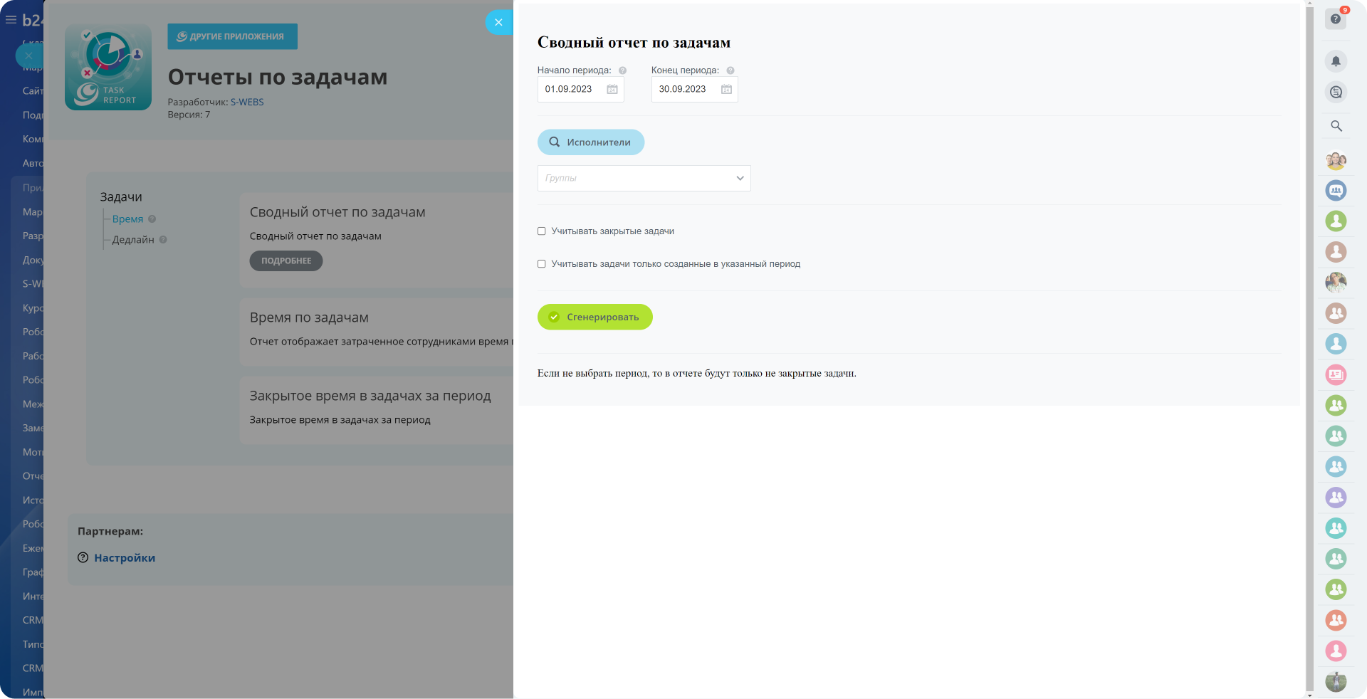 Приложение позволяет формировать "Сводный отчет по Задачам", а так же различные отчеты по модулю «Задачи».