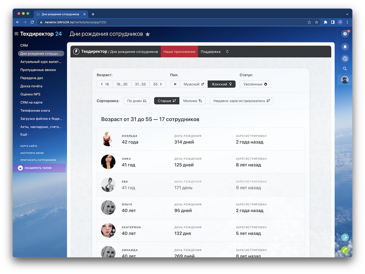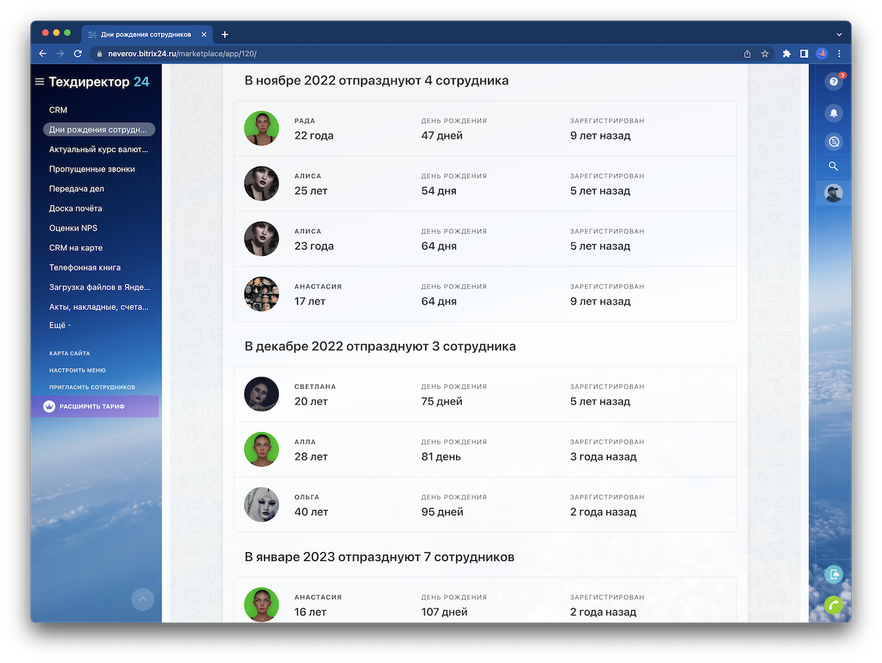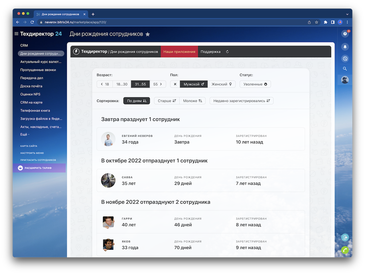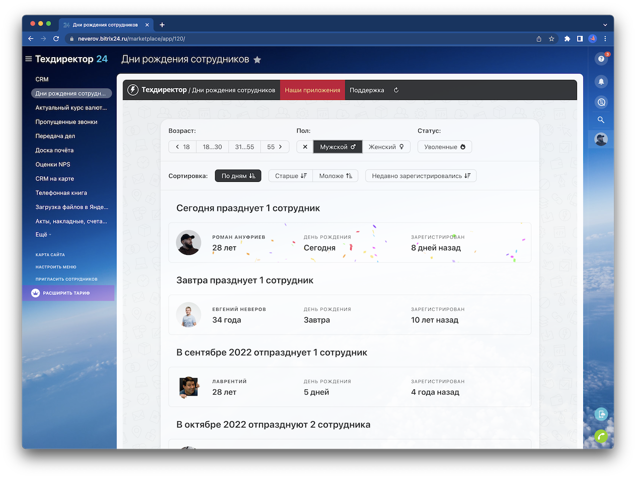 Приложение «Дни рождения сотрудников» добавляет в ваш портал новую страницу с информацией о том, когда у кого из ваших коллег будет день рождения. От вас не требуется никаких настроек, достаточно просто установить приложение.