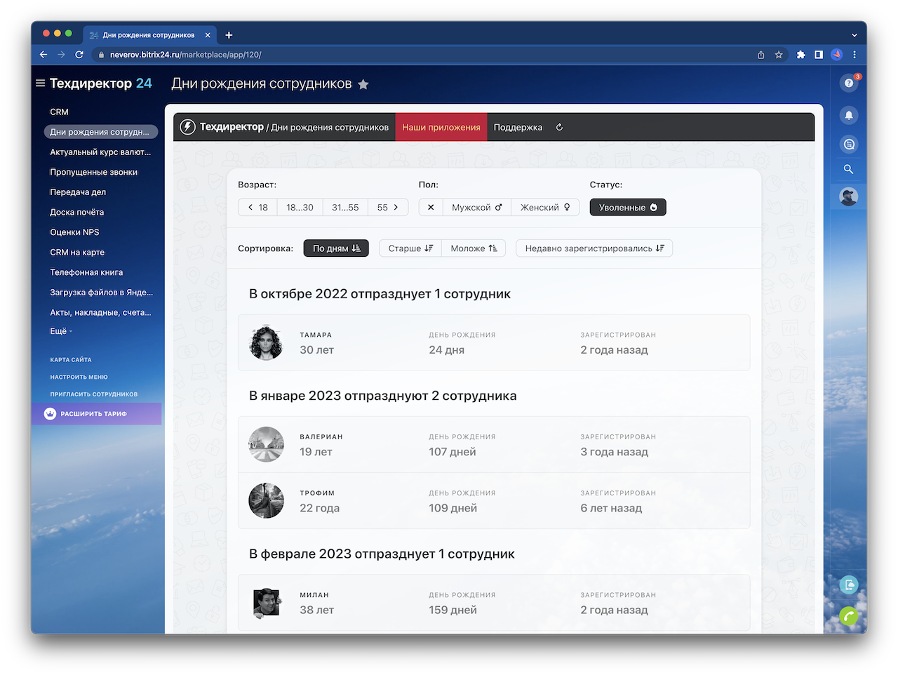 Отдельным списком приложение показывает дни рождения уже уволенных сотрудников.