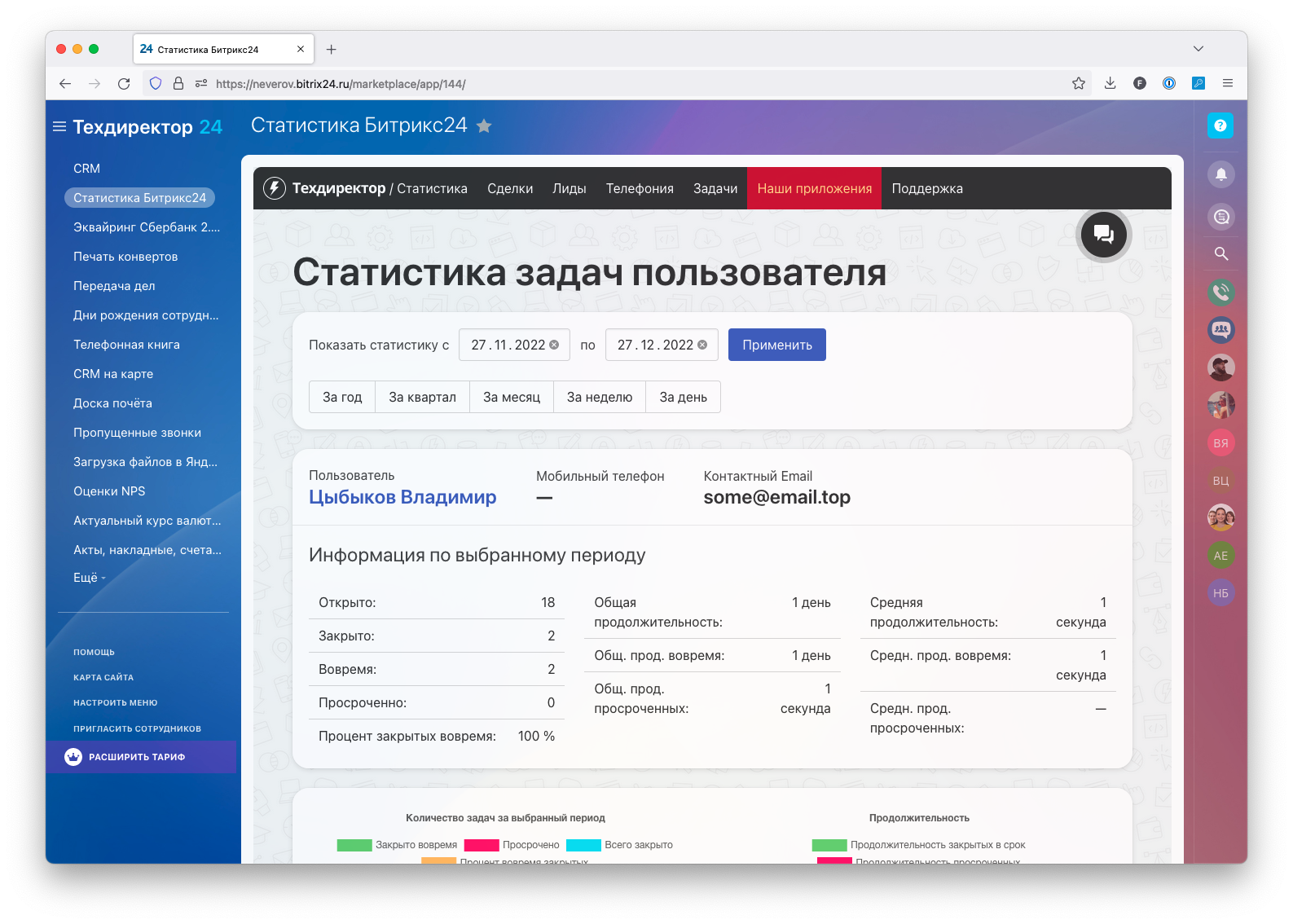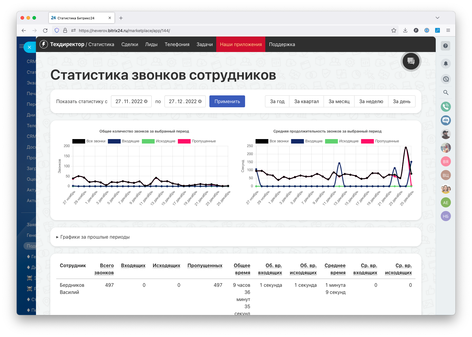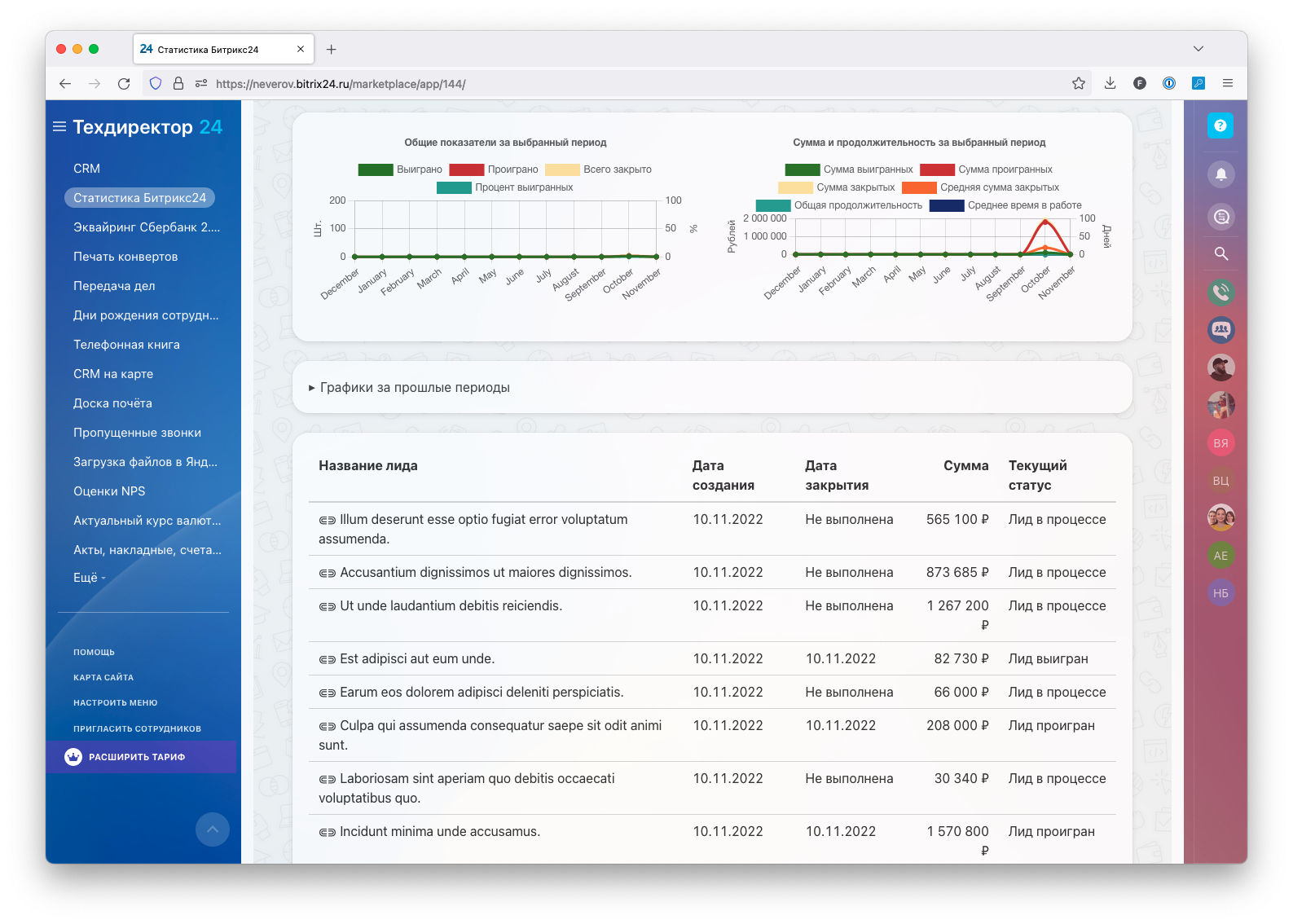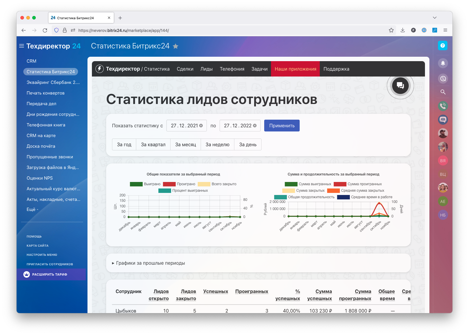 Приложение позволяет формировать и просматривать статистику сделок, лидов, звонков и задач сотрудников в виде таблиц и выводить графики как за выбранный период, так и за предыдущие.