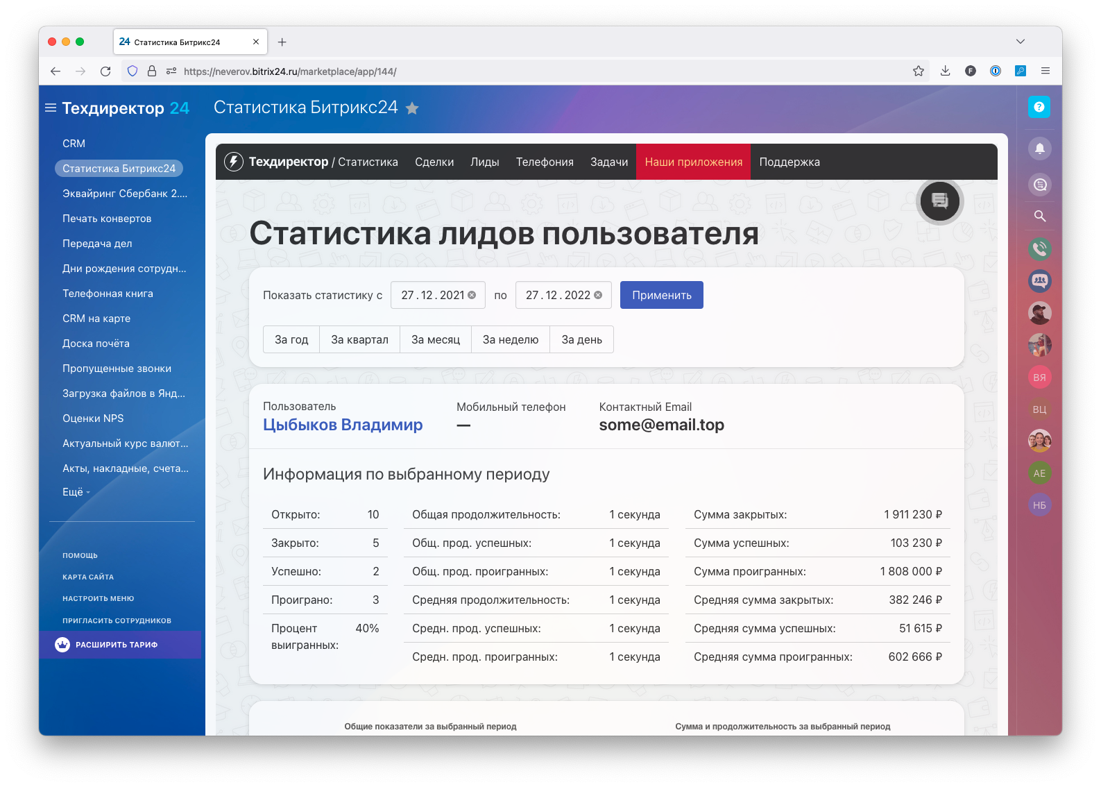 Также можно посмотреть статистику конкретного пользователя за выбранный период с более конкретной информацией по сделкам/лидам/звонкам/задачам. Там же можно перейти на страницу этого пользователя на Вашем портале или просмотреть конкретную сделку, задачу или конкретный лид.
