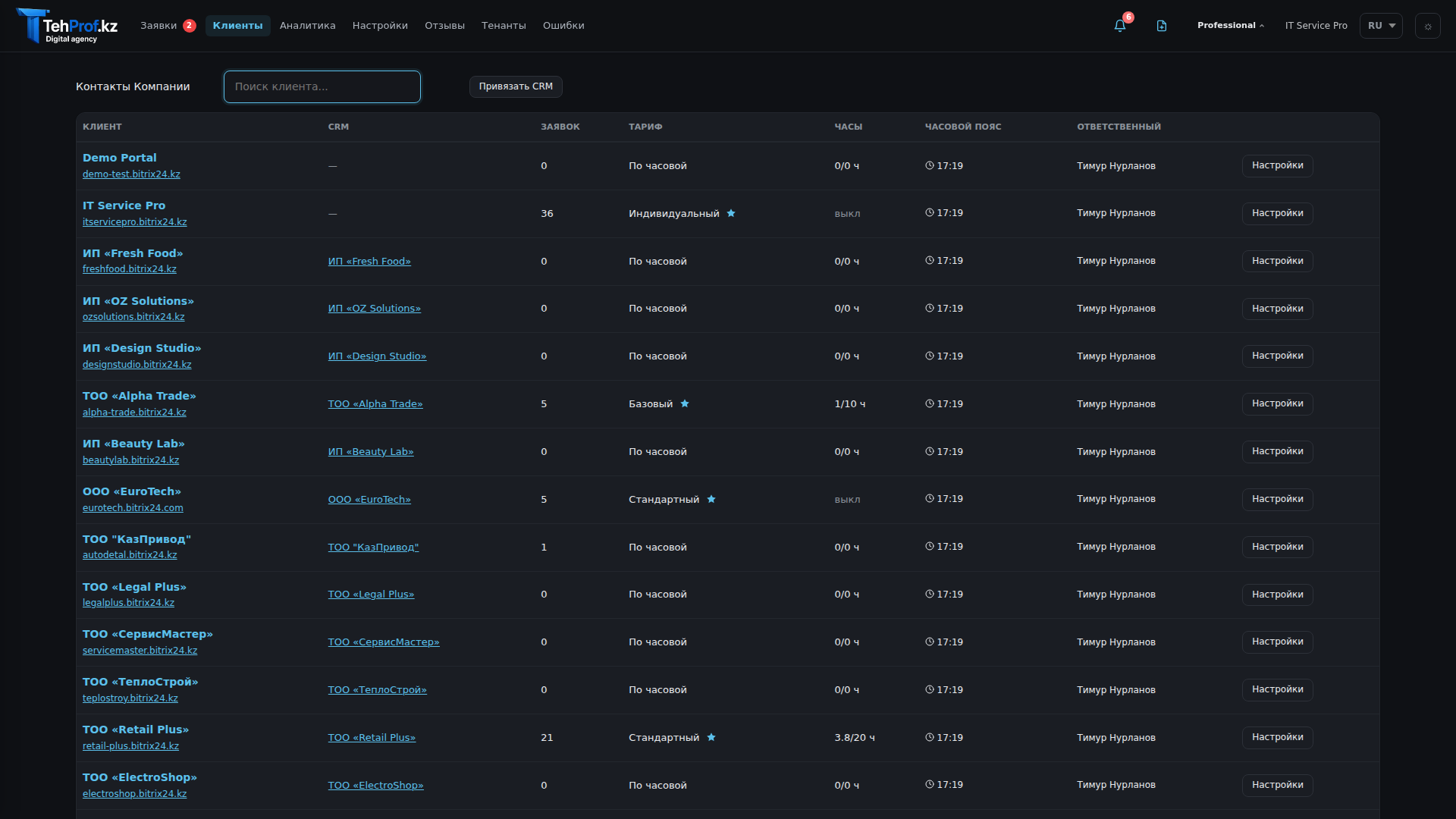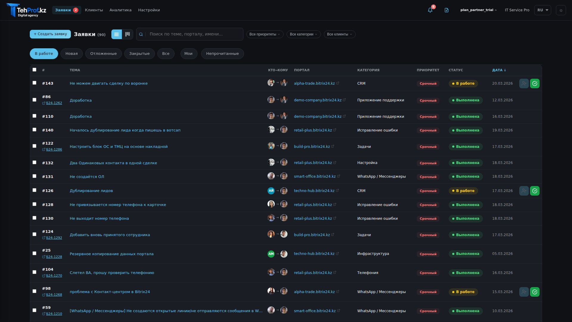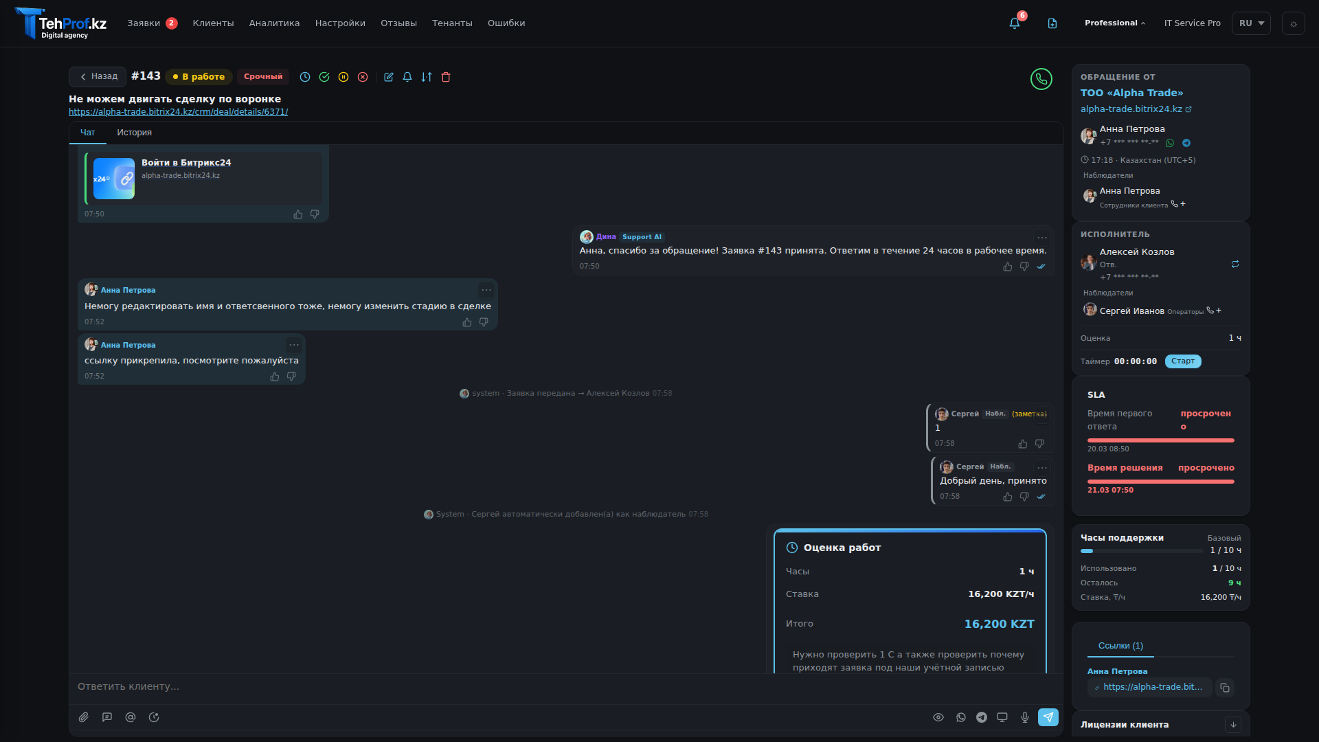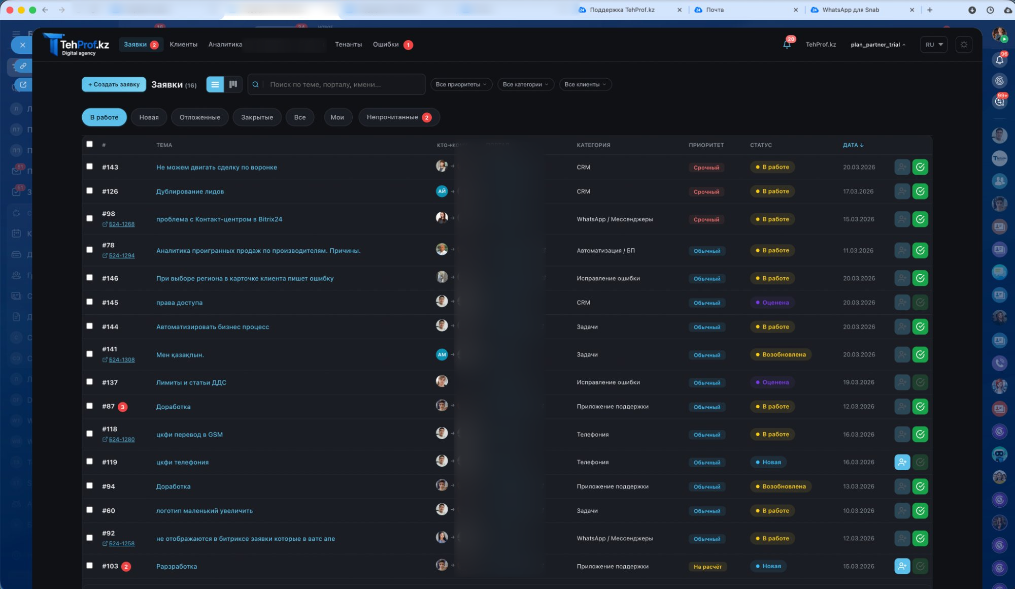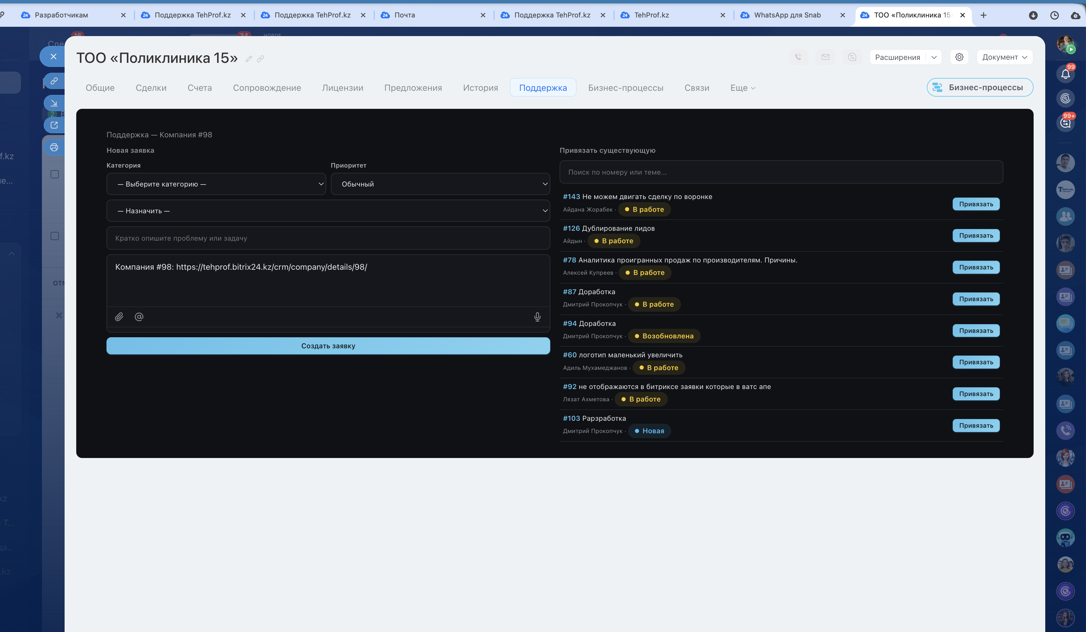 Поддержка TehProf.kz  — helpdesk внутри вашего Битрикс24. Заявки, переписка с клиентом, контроль сроков и аналитика — без переключения между сервисами.