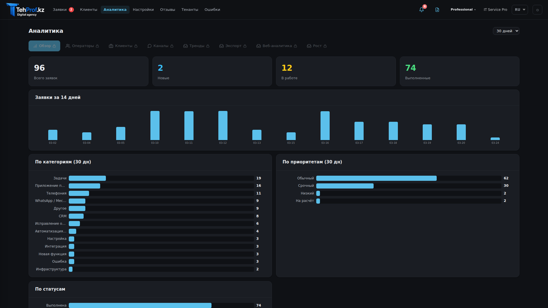 Зачем нужен: Клиенты пишут в чат, на почту, в мессенджеры — обращения теряются, сроки срываются, никто не знает, сколько часов потрачено. TehProf Support собирает всё в одном месте и даёт полную картину: кто, что, когда и сколько.